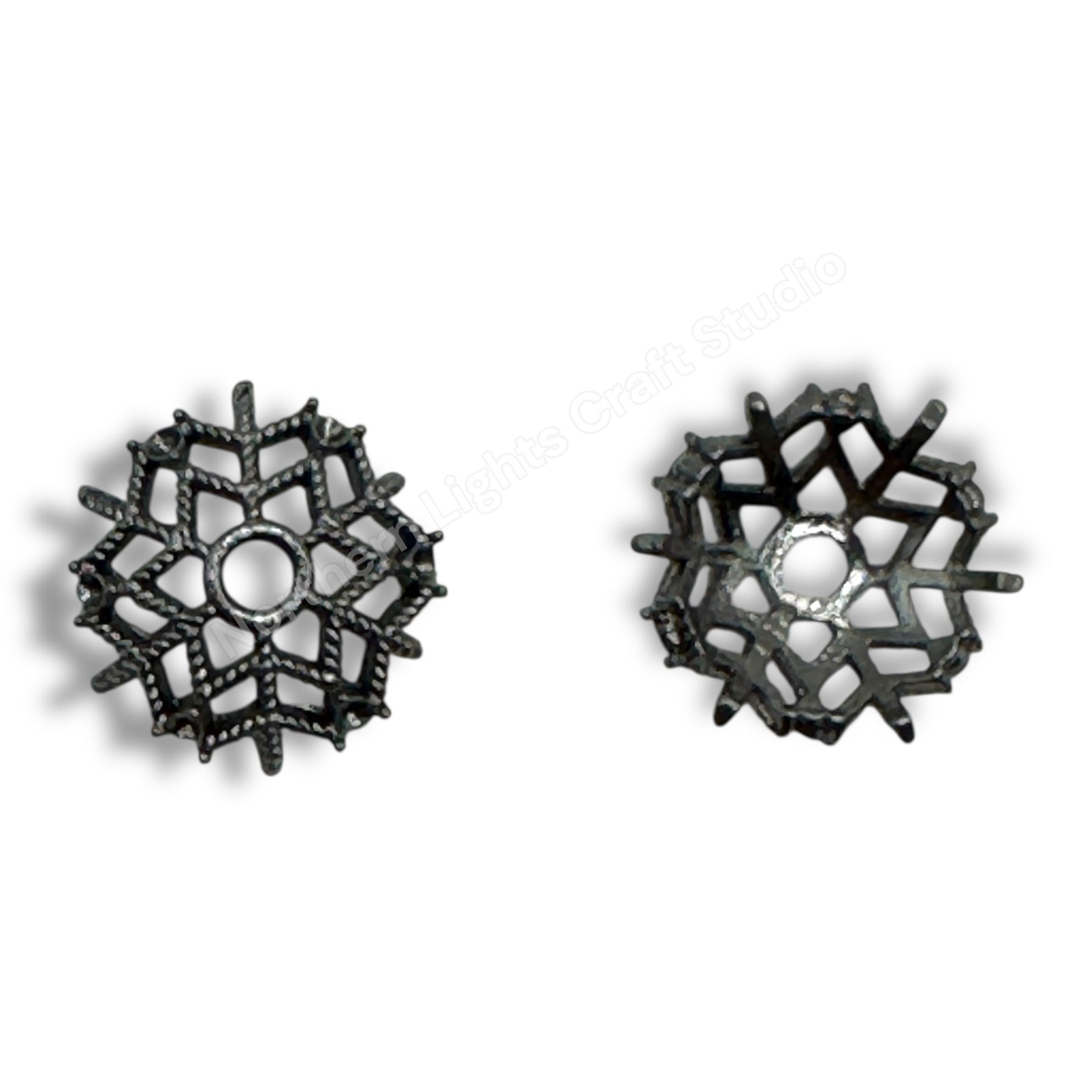 Price is for 10 metal star bead caps. These bead caps are 14mm in size and made of metal. The holes are large enough to fit pens. See photos for examples of how they fit on a different size beads.