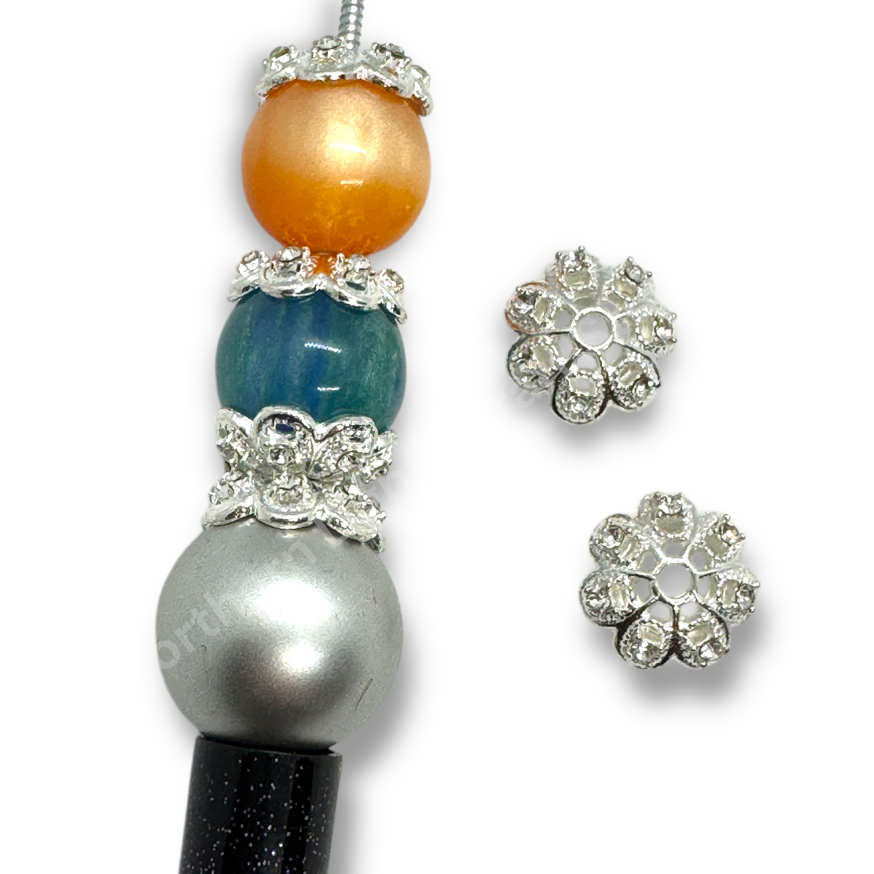 Price is for 10 metal flower rhinestone silver 16mm beadcaps that fit 16, 18, or 20mm beads. These luxury bead caps are 16mm in size and made of metal. with rhinestones in each petal.  The holes are large enough to fit pens. The design features a star in the middle with crystal rhinestones on the top of each star.