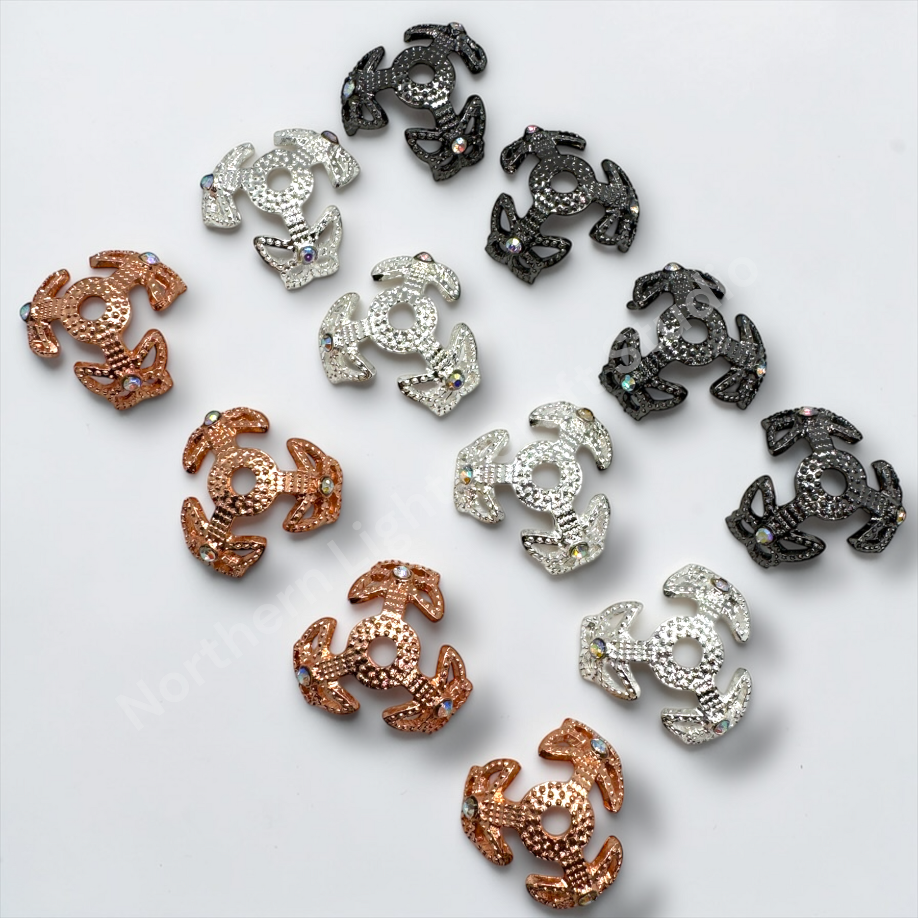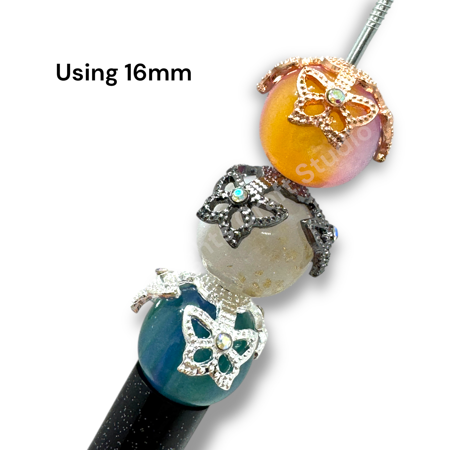 Price is for 10 metal butterfly with crystal beadcaps that fit 16mm beads. These luxury bead caps are 16mm in size and made of metal. The holes are large enough to fit pens. The design features a star in the middle with crystal rhinestones on the top of each star.