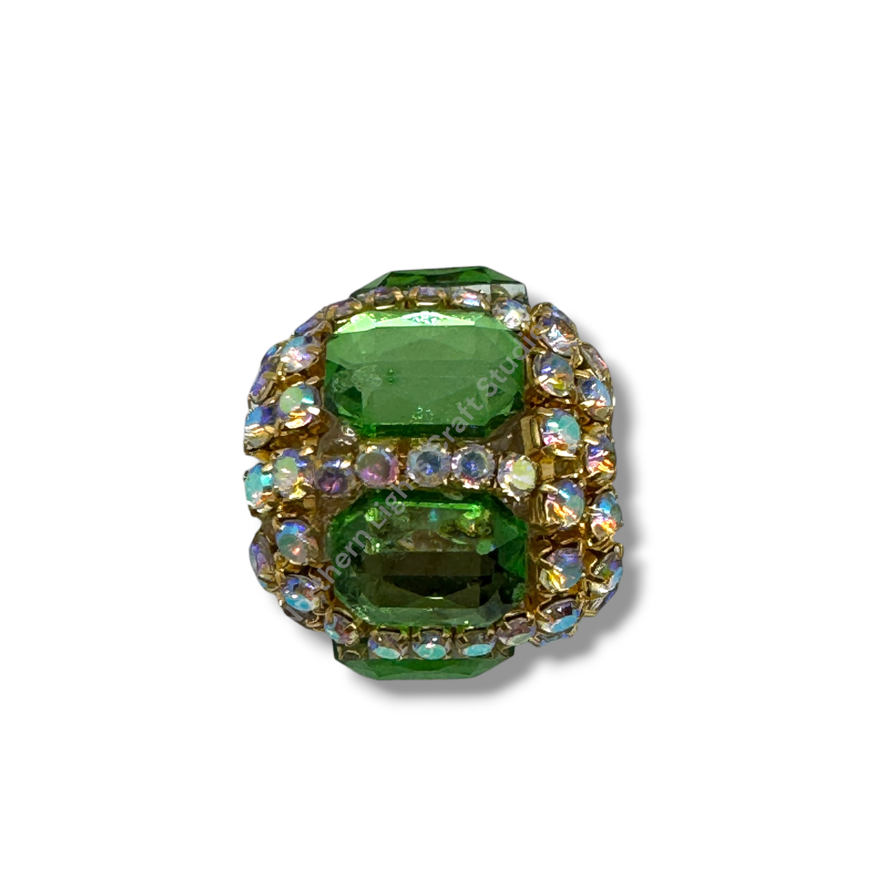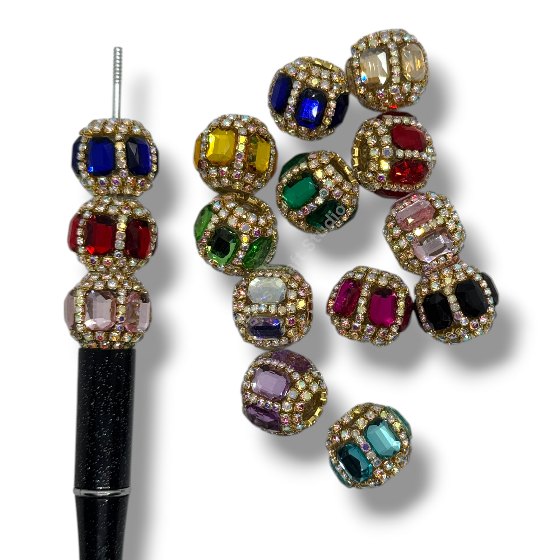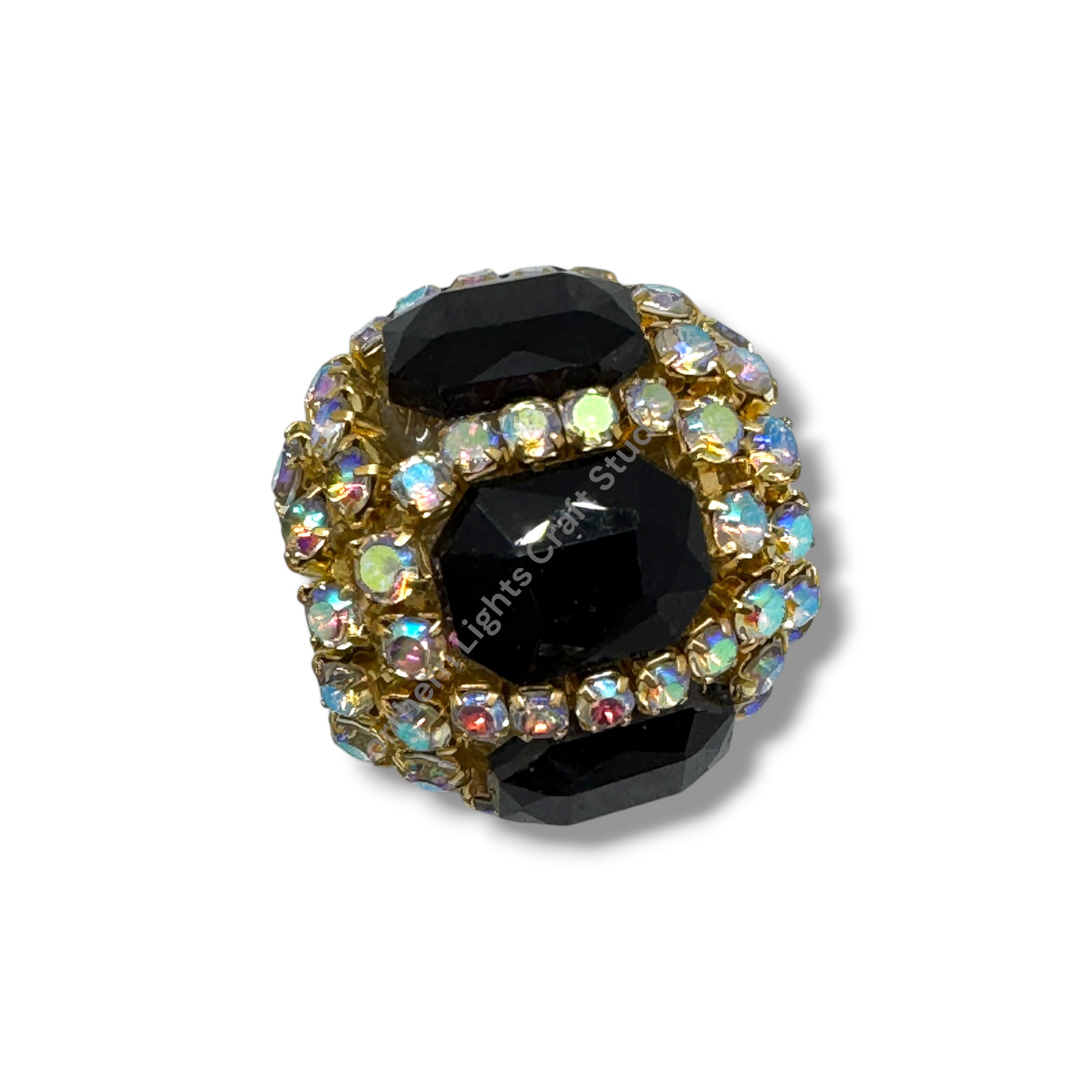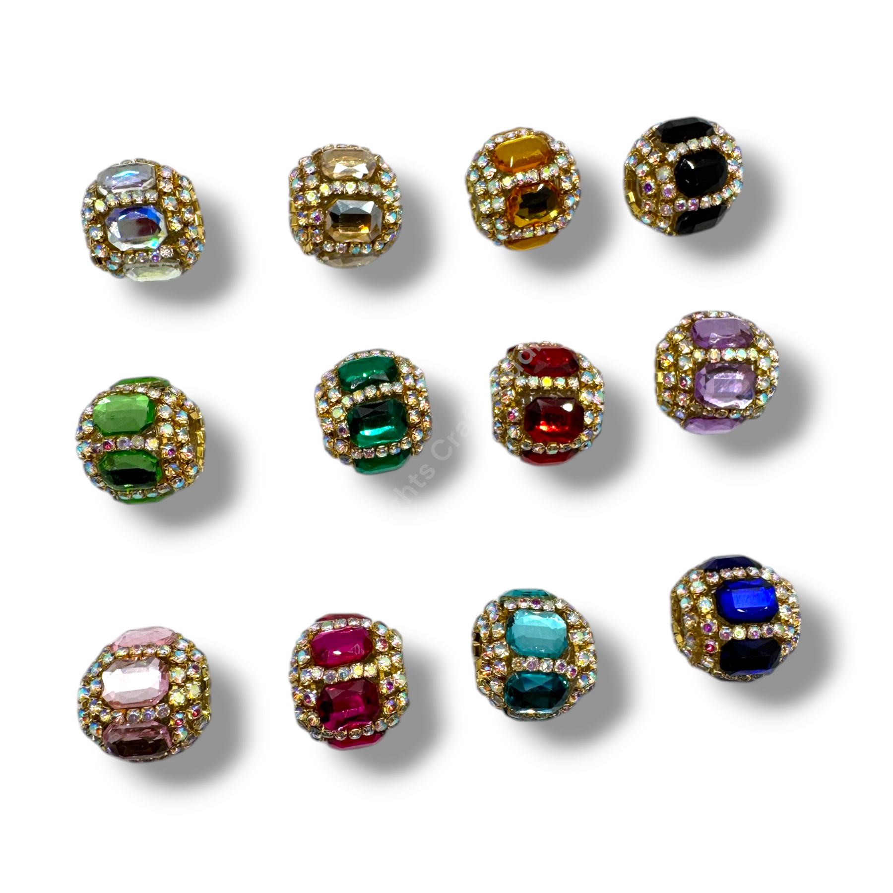 Price is for either three pieces of the same color - you choose, or a 10pc. randomly mixed bag.  Beads feature a rhinestone chain with gold finish and crystals that give these beautiful fancy beads an almost mirror look.  Beads are approximately 17mmx16mm with a 2.7mm hole.
