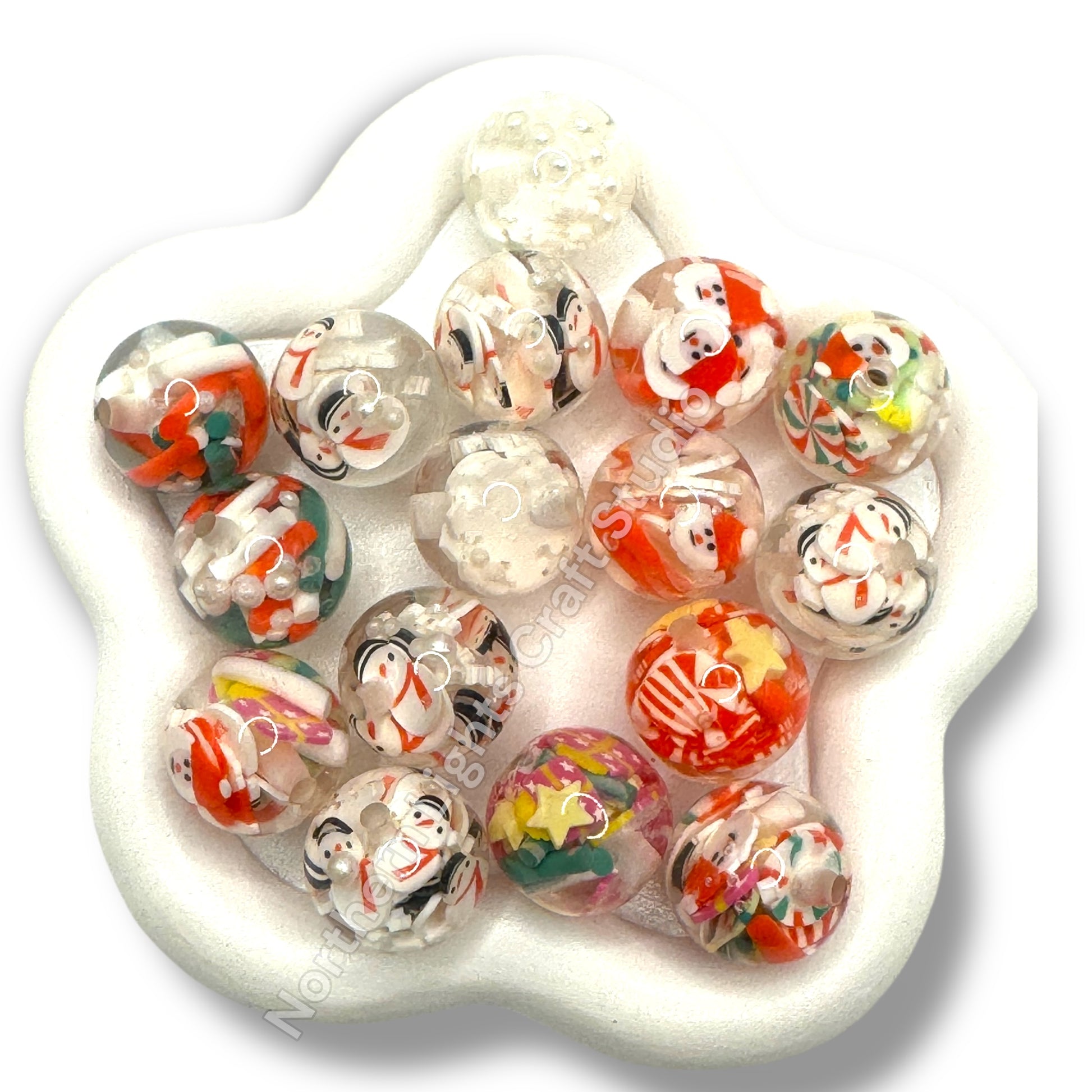 Price is for one bag of 10 pieces of 16mm acrylic or resin beads - choose your style. The holes are big enough to fit on beadable pens or beadable bar keychains. These beads feature a variety of printed designs and shapes. The Snowglobe beads are resin and have christmas charms INSIDE the bead.