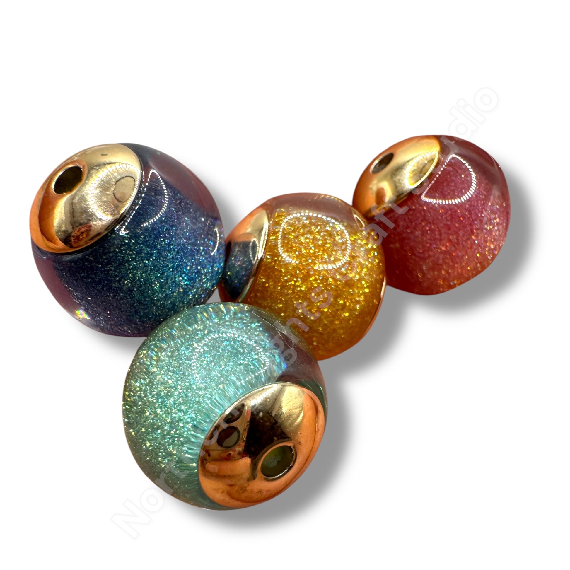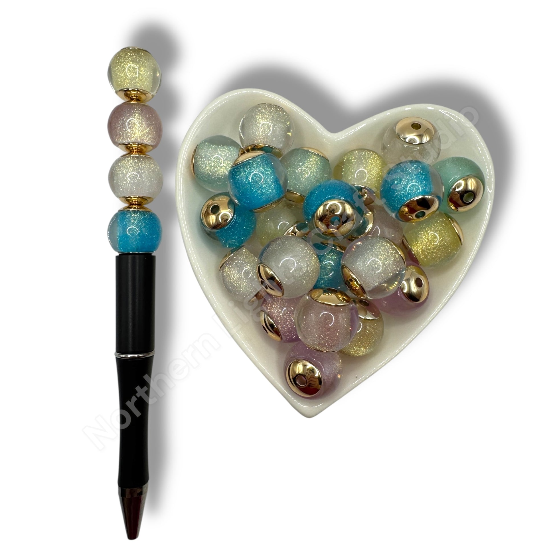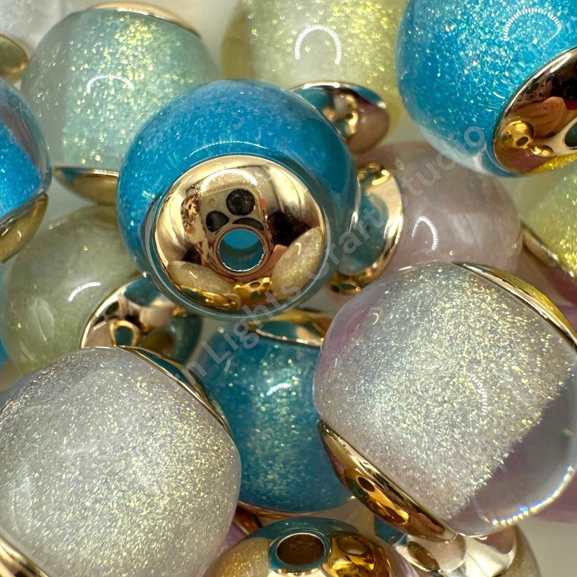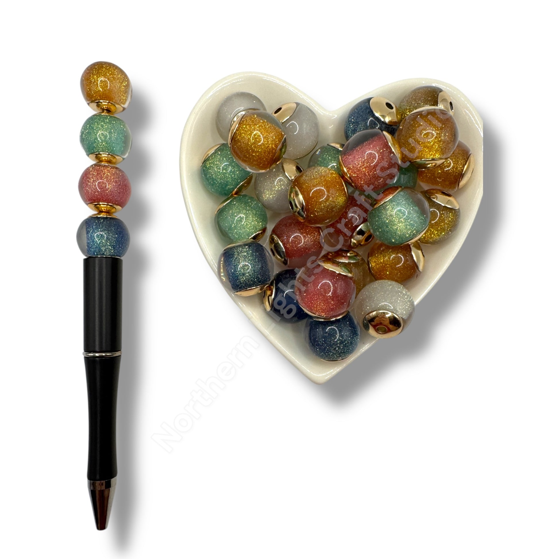 Price is for one randomly picked 20 piece mixed color pack of 16mm acrylic beads. There are two color mixes to choose from, one is the lighter colors, and one is the warm tones. Each bead has a gold cap embedded on both the top and the bottom of the beads, and the hole is 2.8mm which is big enough to fit beaded pens. The inside of the bead features a rich glitter layer around the core to give this bead a truly stunning look. Elevate your DIY projects with these rich looking pieces!