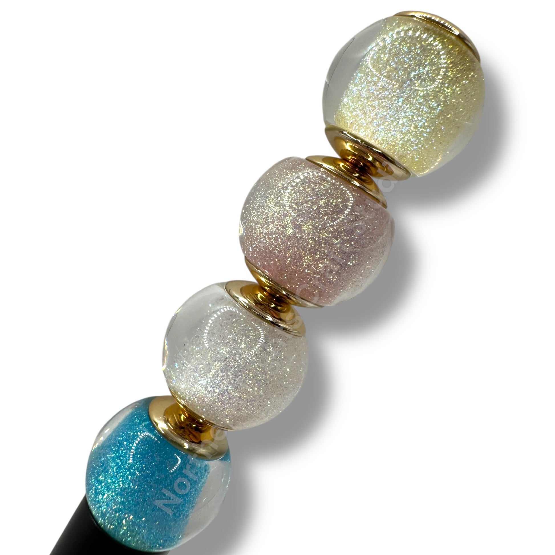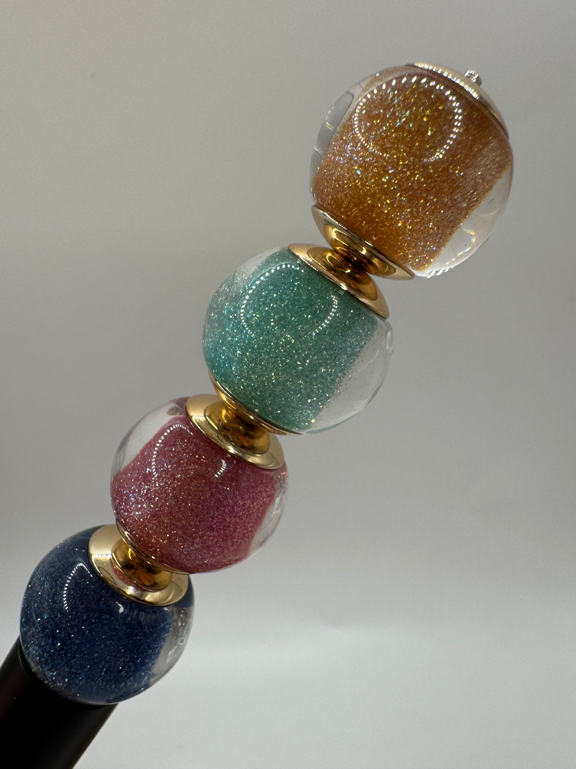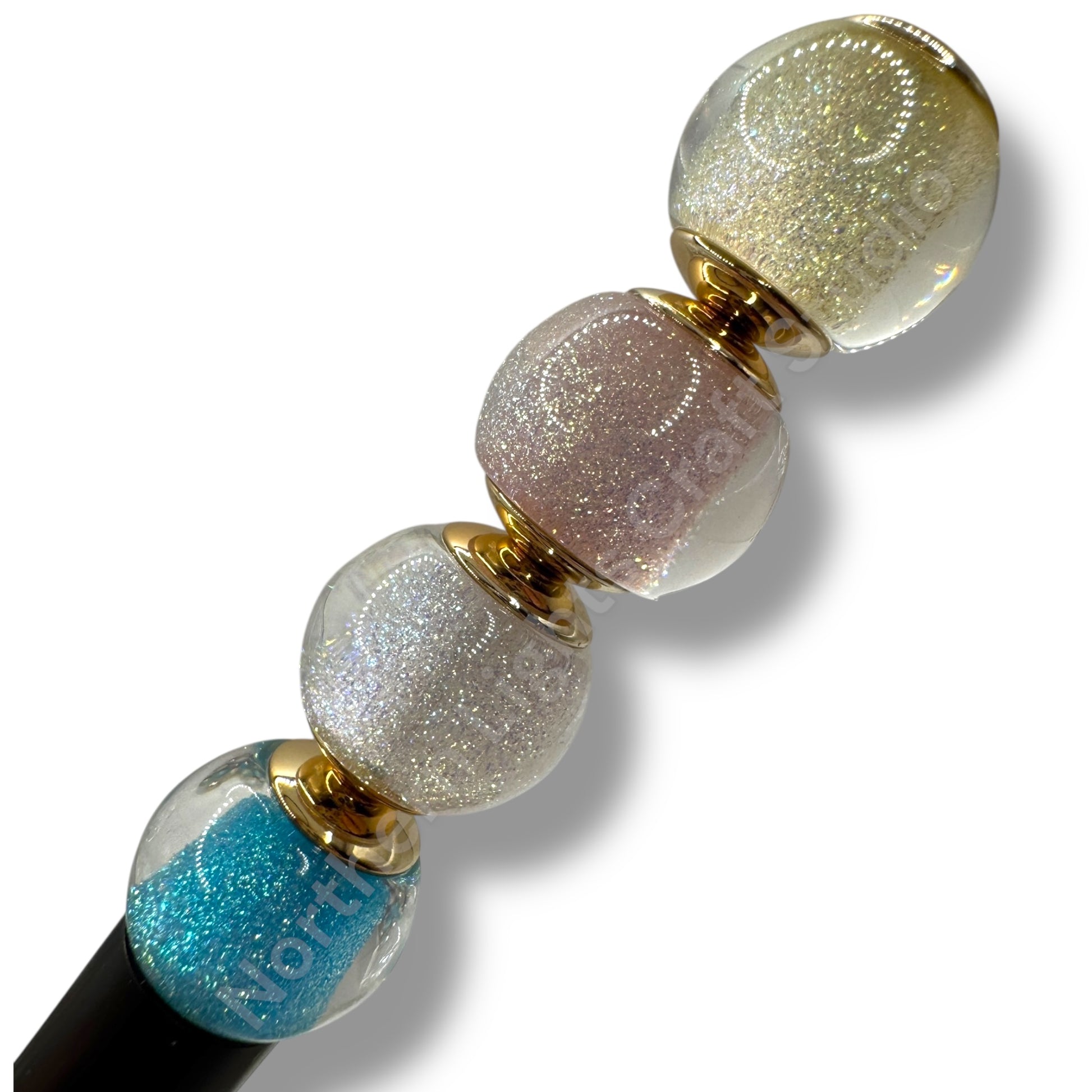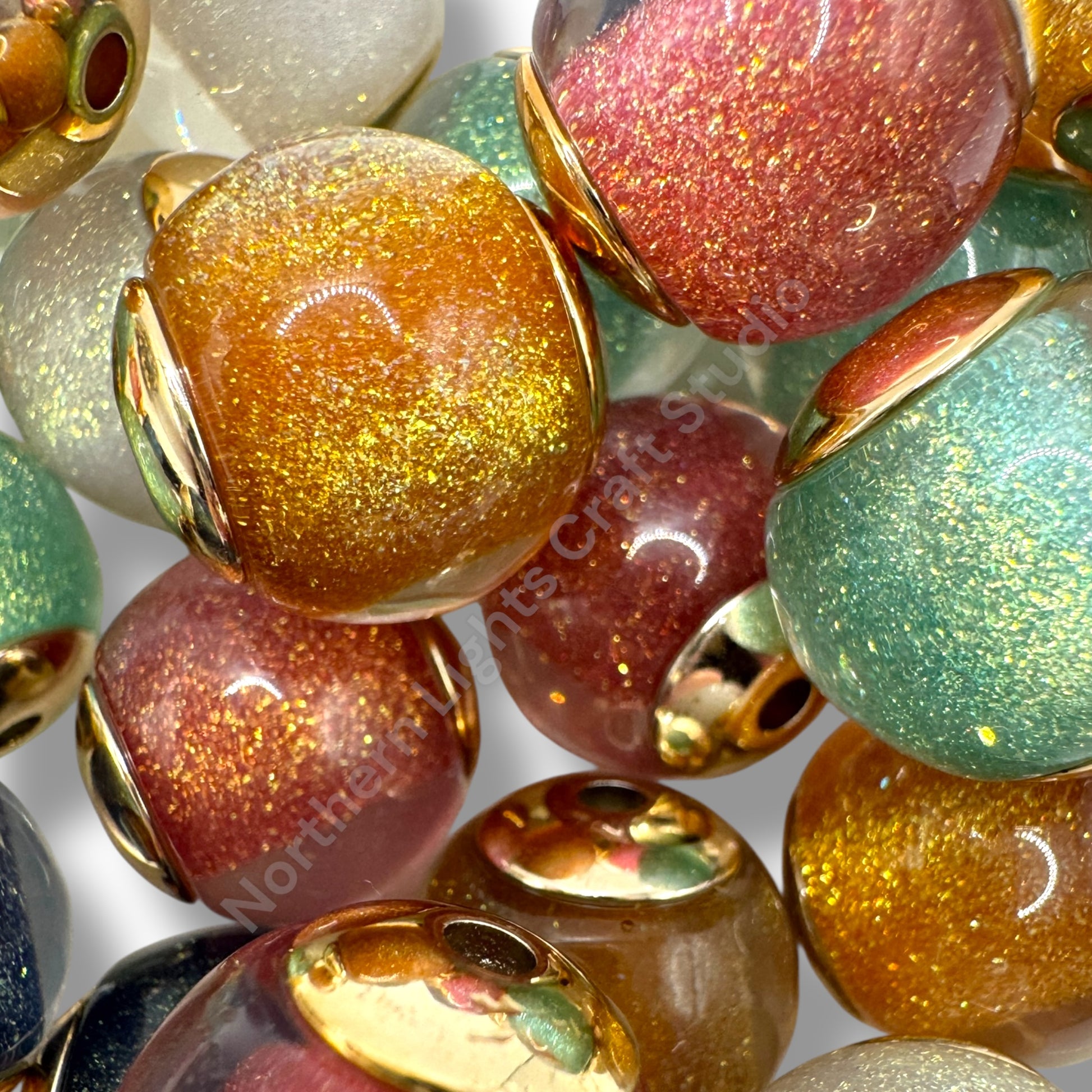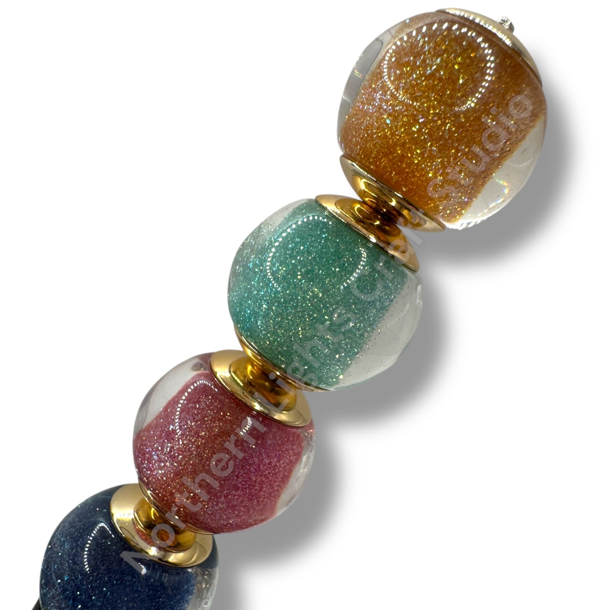 Price is for one randomly picked 20 piece mixed color pack of 16mm acrylic beads. There are two color mixes to choose from, one is the lighter colors, and one is the warm tones. Each bead has a gold cap embedded on both the top and the bottom of the beads, and the hole is 2.8mm which is big enough to fit beaded pens. The inside of the bead features a rich glitter layer around the core to give this bead a truly stunning look. Elevate your DIY projects with these rich looking pieces!