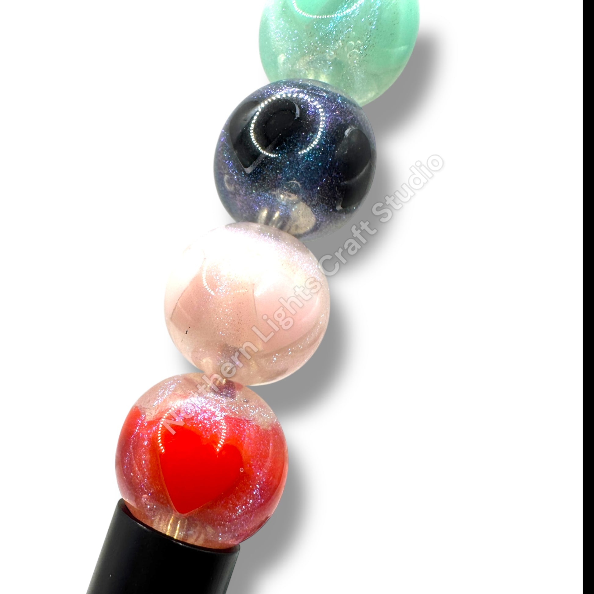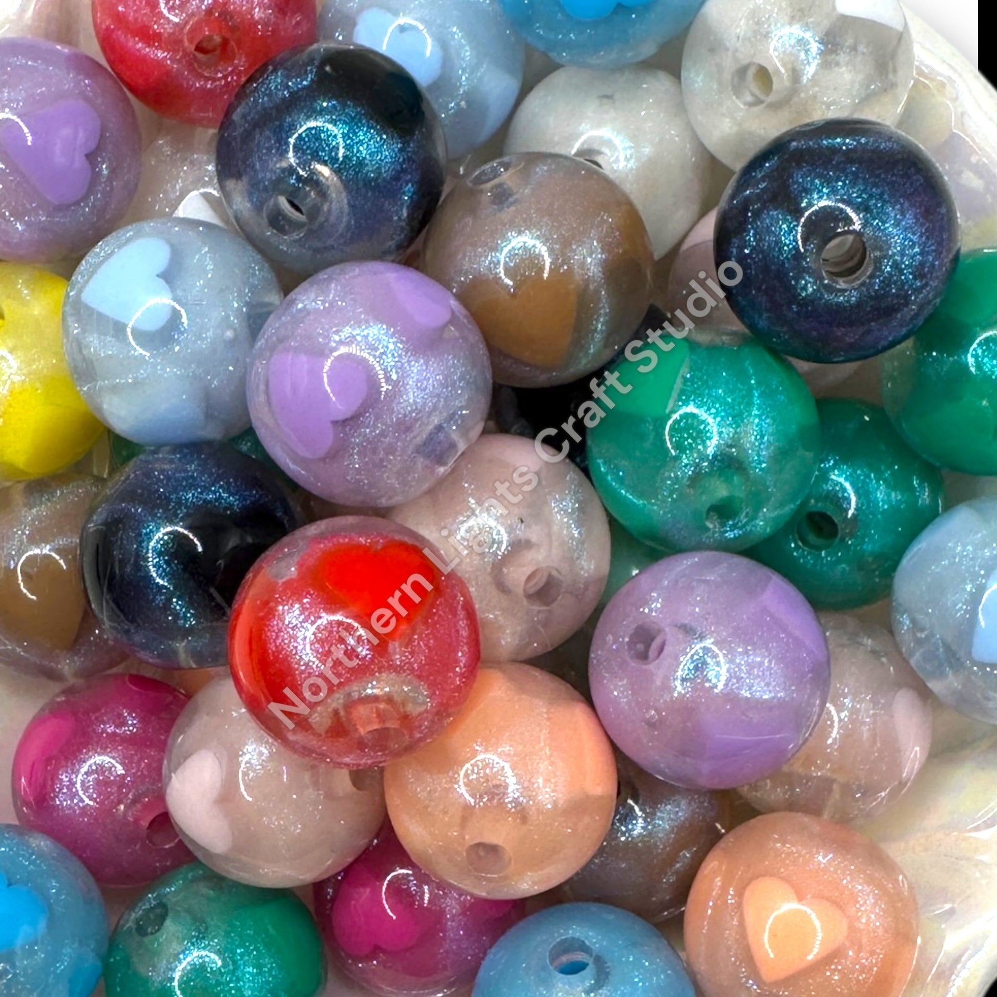 Price is for one randomly picked mixed color pack of 20 beads. Beads are 16mm and are made of acrylic. Beads have glittler with hearts printed on the outside of the bead to give a double layer effect. Extra glam!