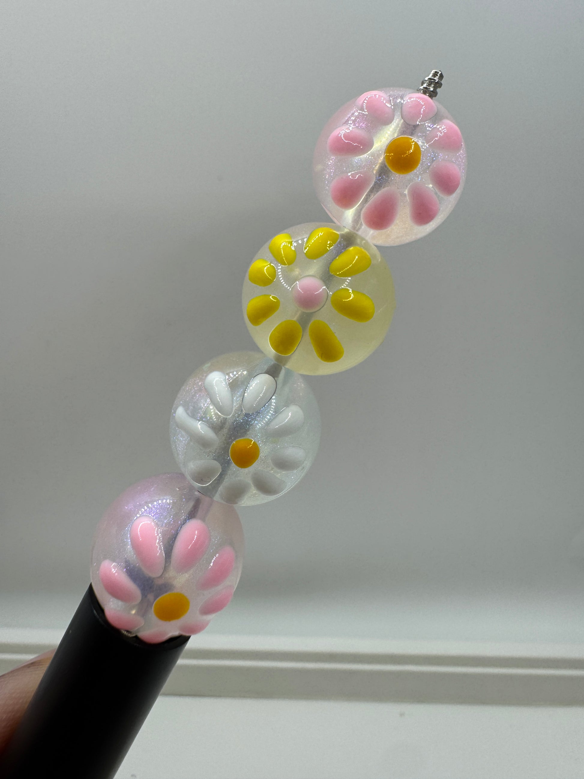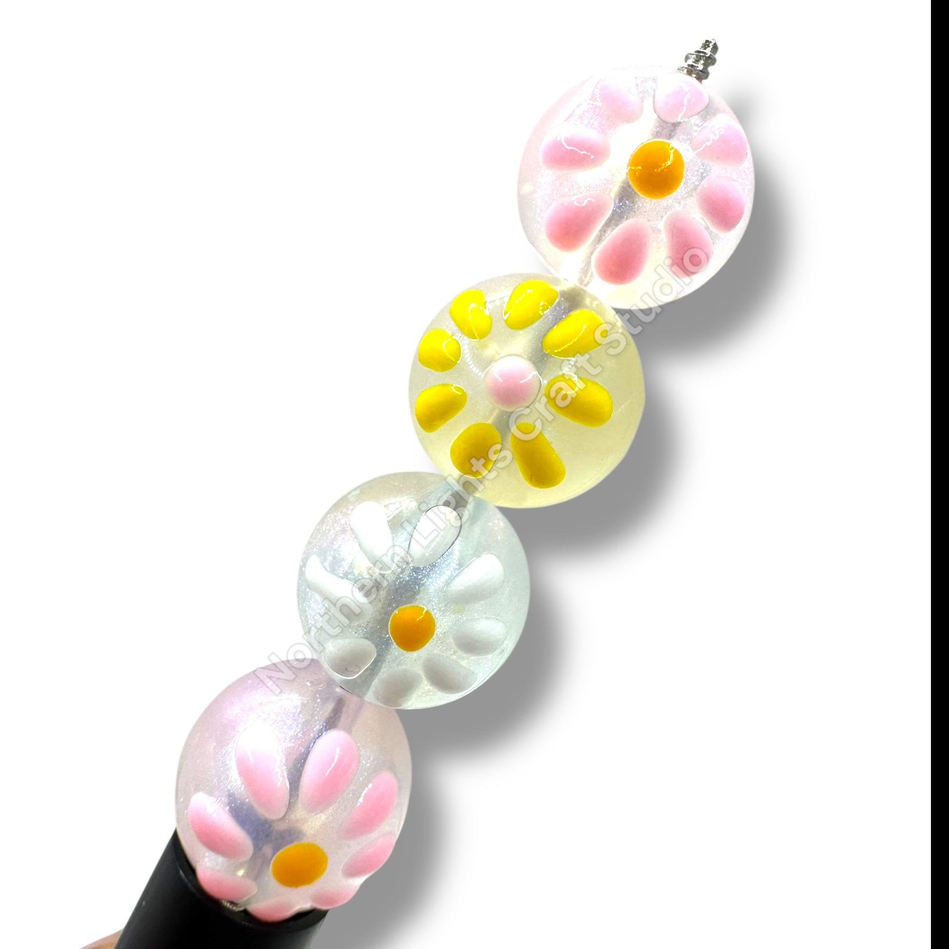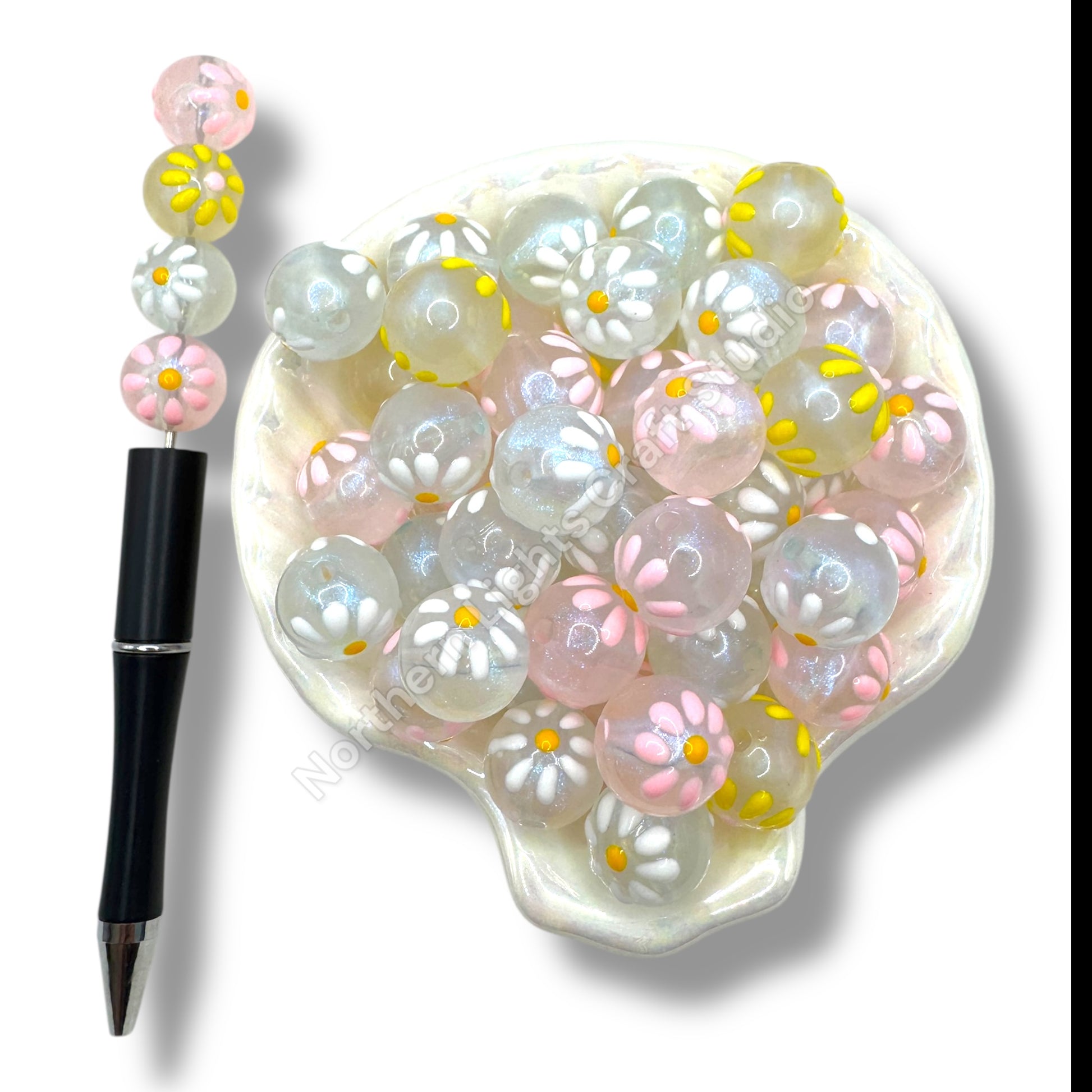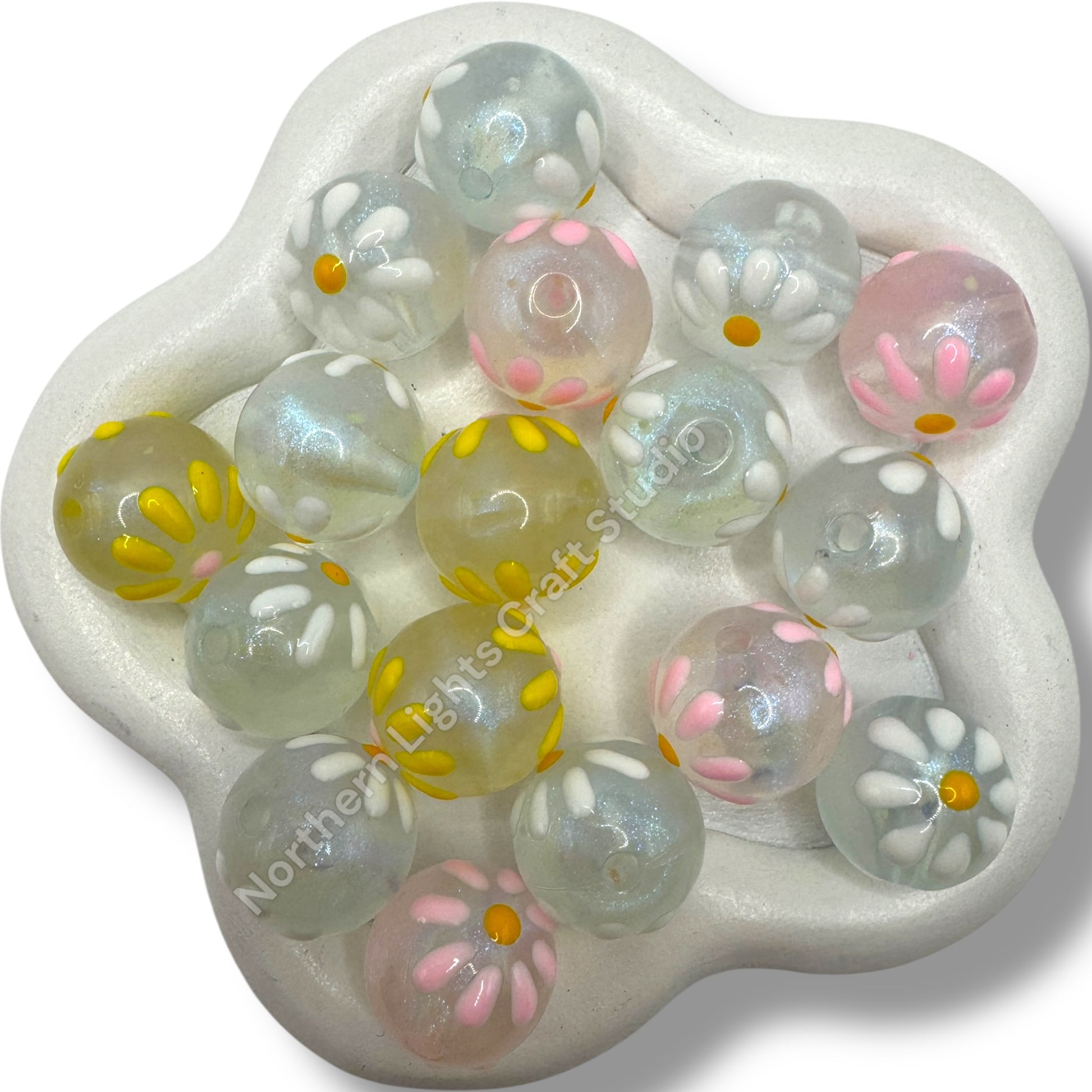 Price is for one randomly picked mixed color pack of 20 beads. Beads are 16mm and are made of acrylic. Each bead is handpainted with a daisy on top of the clear acrylic base bead. Due to the handmade nature of these beads, there will be slight irregularities and differences in the handpainted flower.