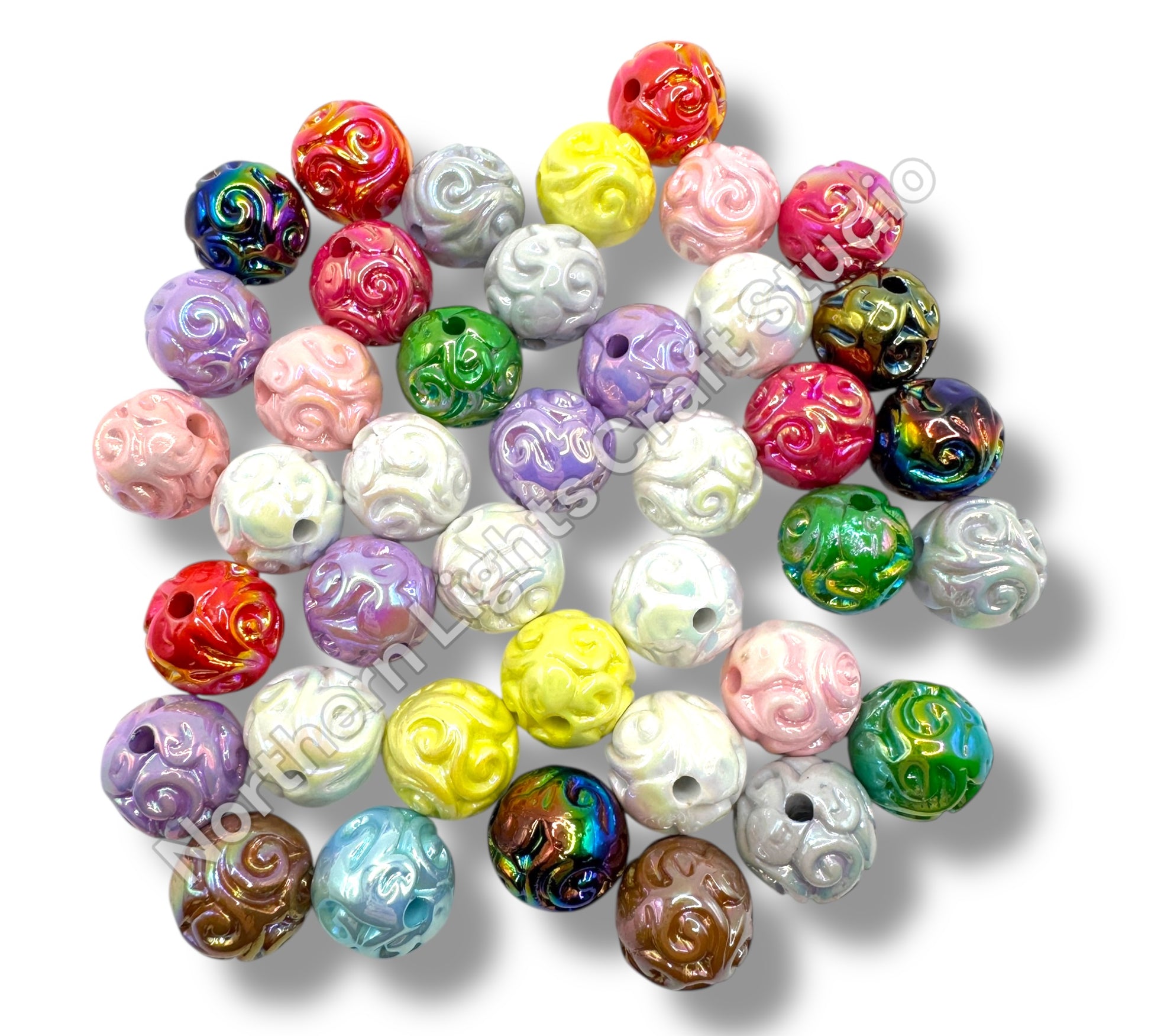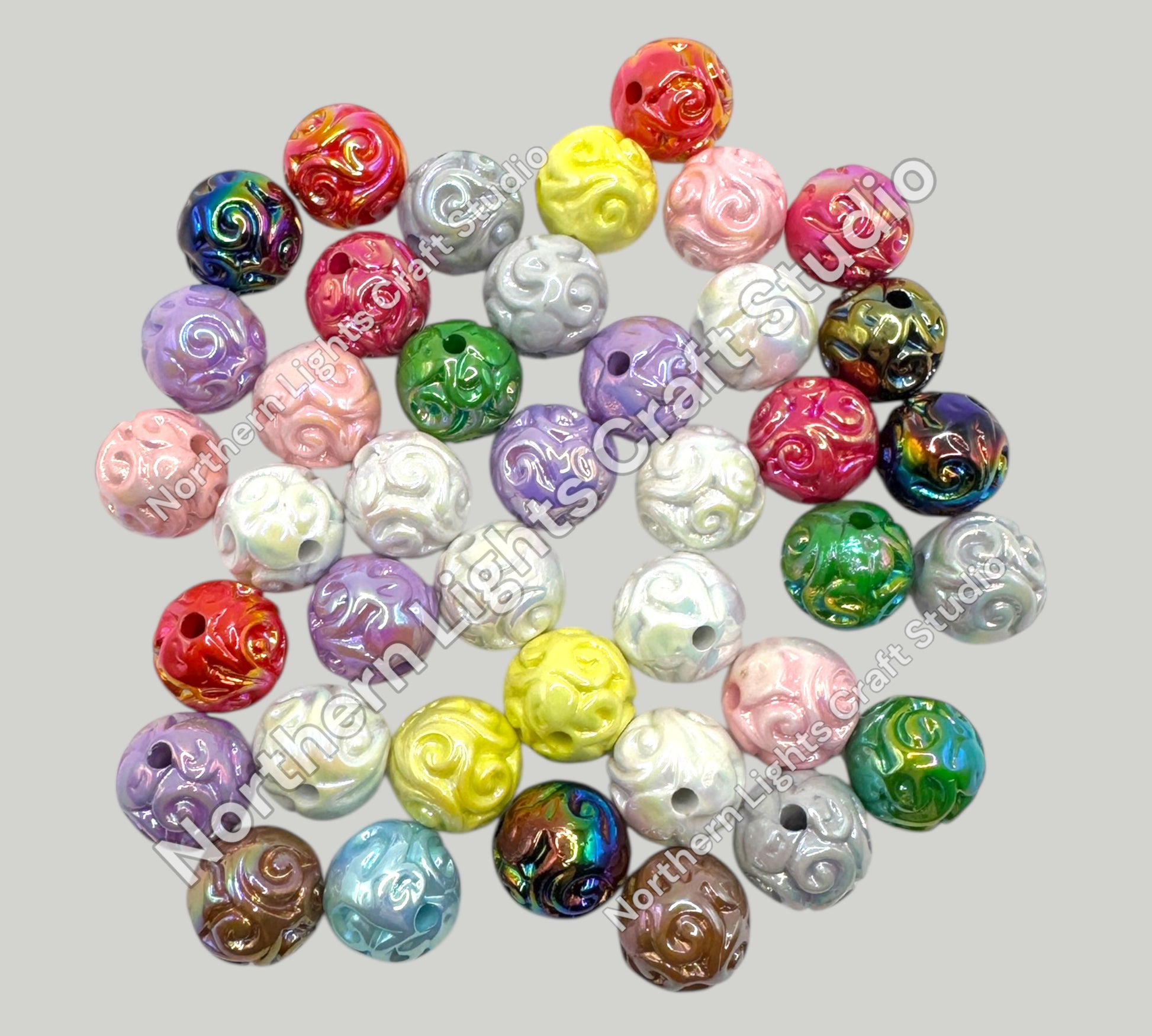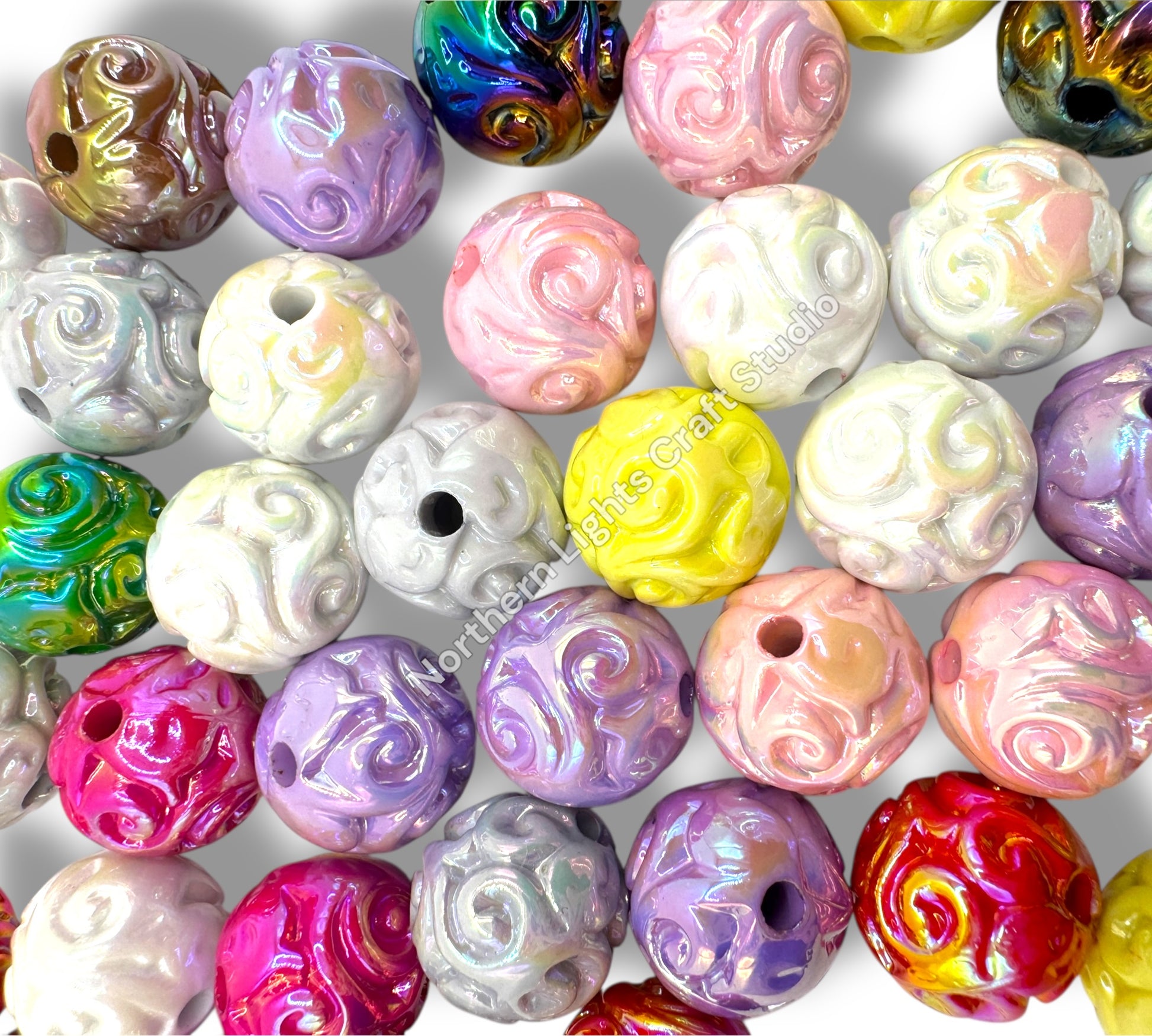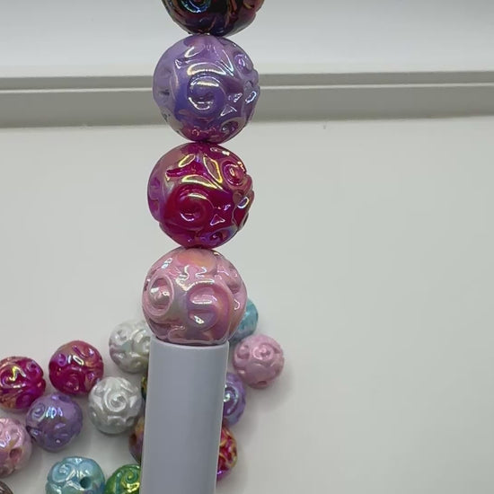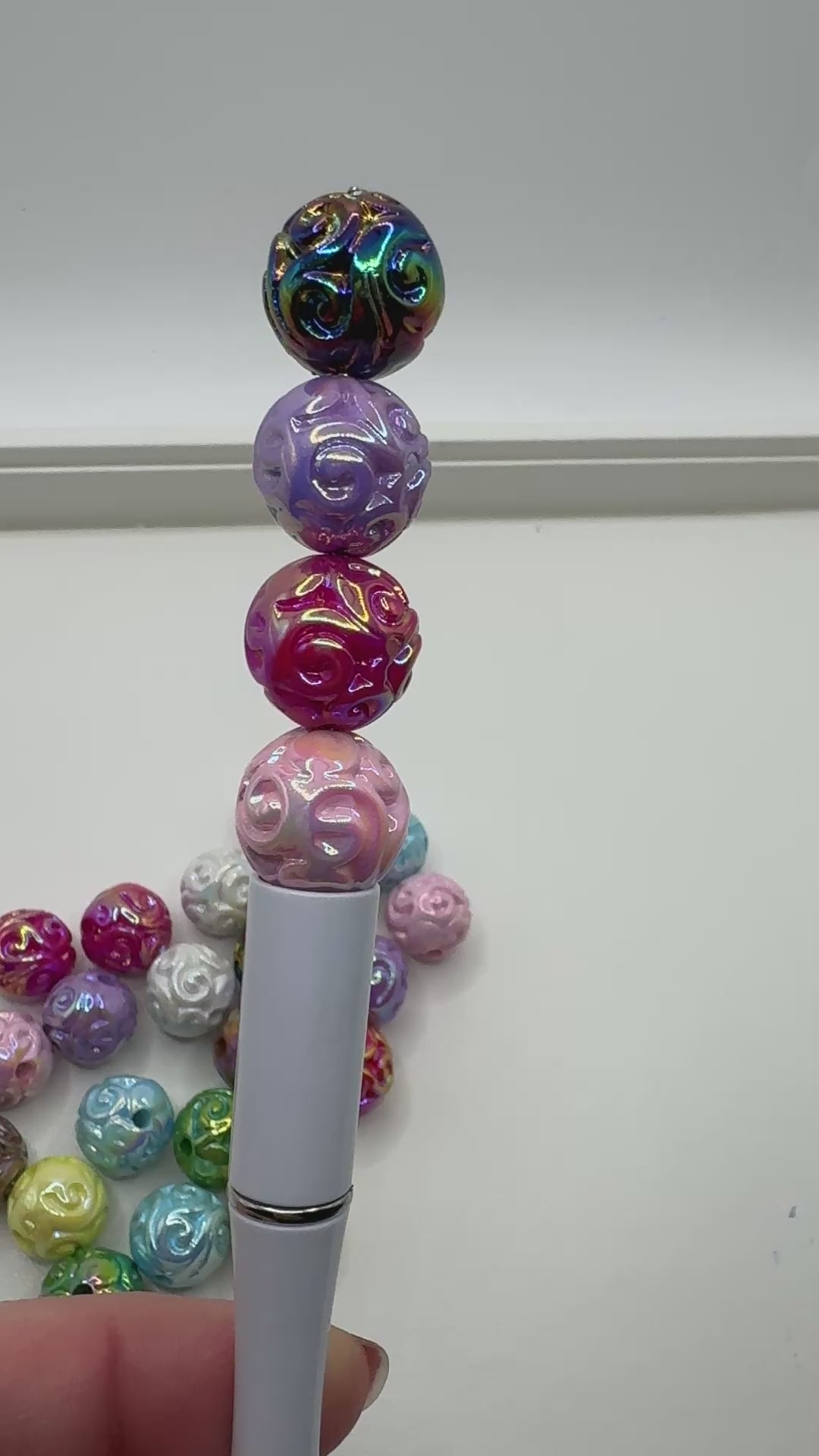 Beads are 16mm. Price is for one pack of 20 UV coated carved flower beads in a mix bag. Colors may vary in each mix. The holes are big enough to fit on beadable pens or beadable bar keychains.