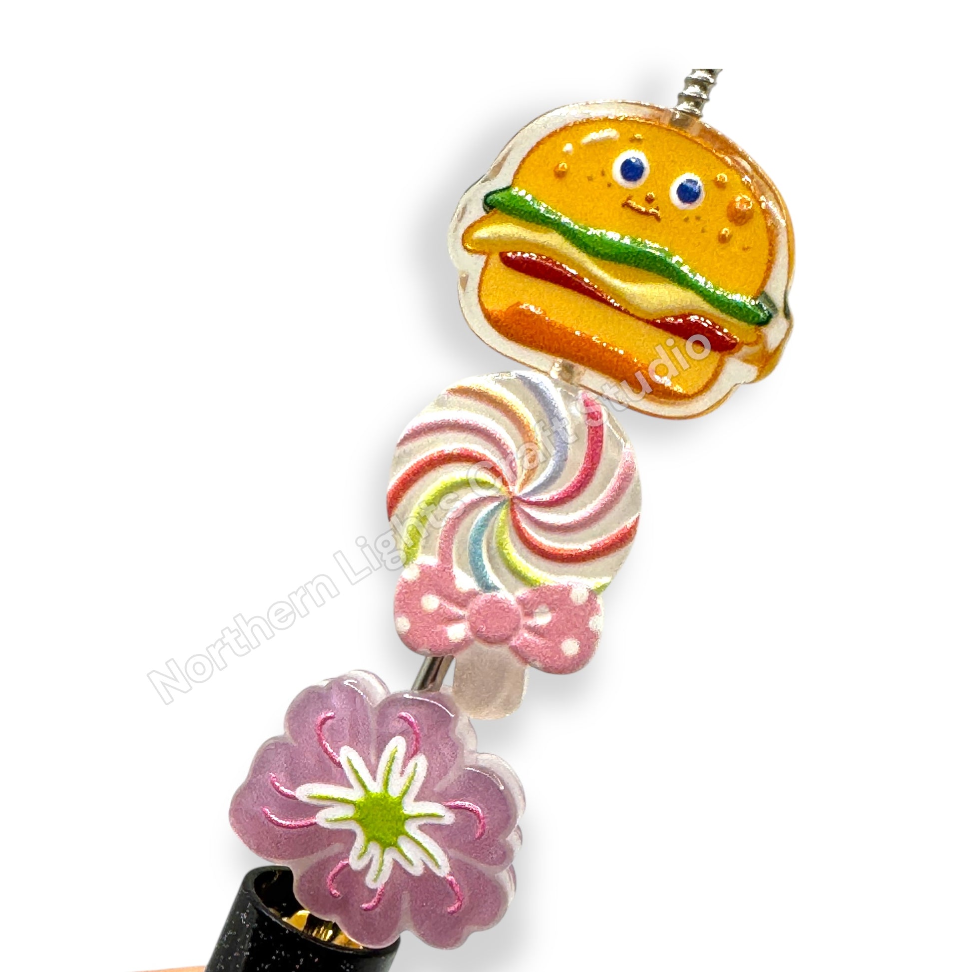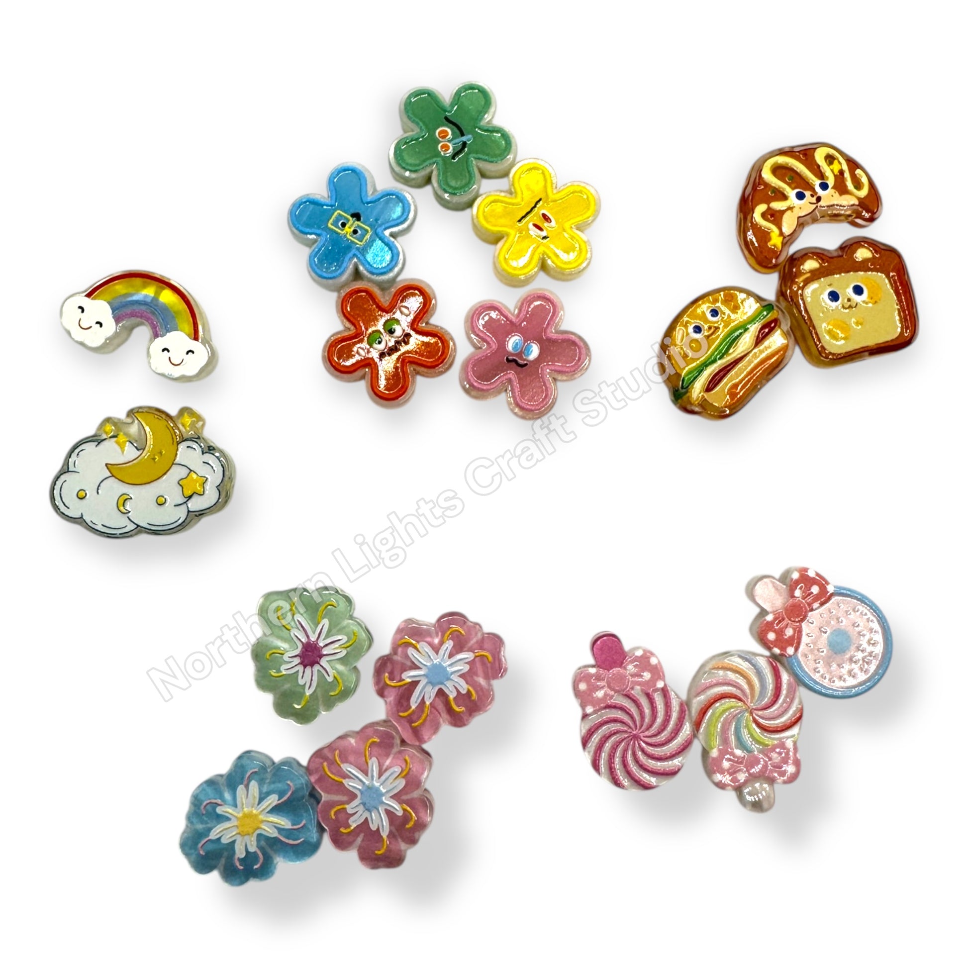 Price is for a mix of acrylic charm beads - see options for price and piece count! Mixes are pulled at random for each theme, so there may be duplicates. Dimensions are below. Holes are just big enough to fit pens, you may have to lightly twise them to go down the pen.