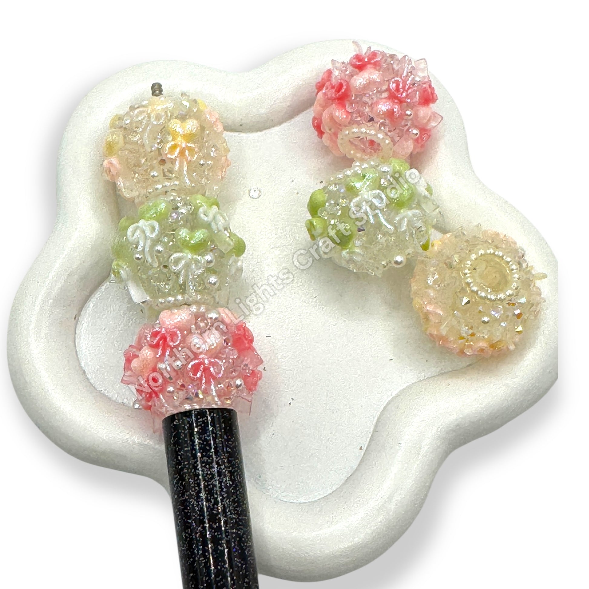 Price is for 3 pieces. These 20mm acrylic beads have pearls and acrylic charm embellishments. Each of these beads is handmade, so there may be irrregularities in spacing, etc. Note: is is common for the small pearls to come loose during shipping. To replace the pearl, just add a small amount of strong glue (I like brush-on glue) and secure the pearls.
