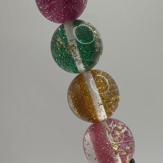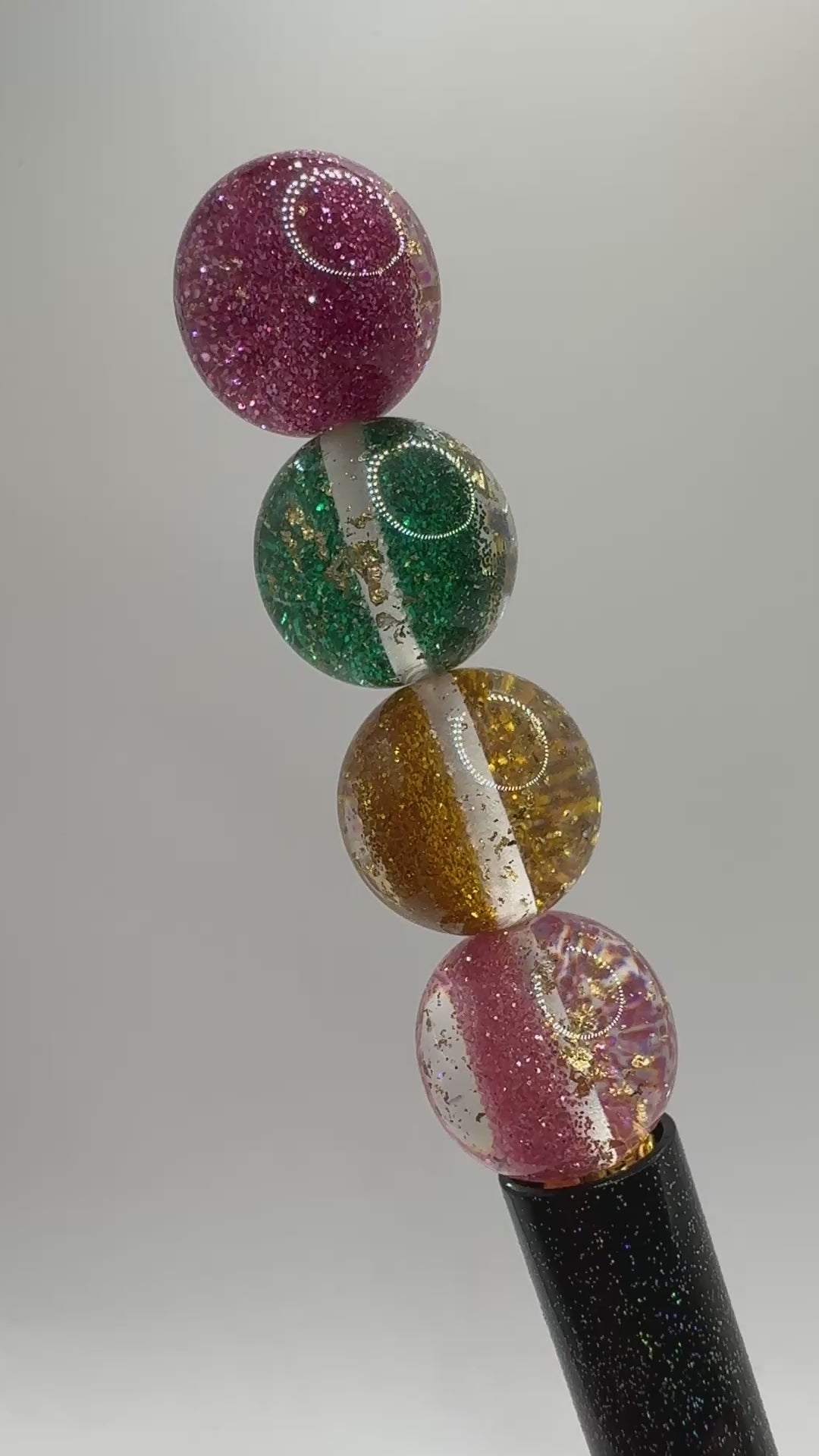 Price is for one radomly mixed 20pc. color bag of 16mm beads. Beads feature a sparkly glitter interior with gold flakes inside. Holes are big enough to fit beaded pens.
