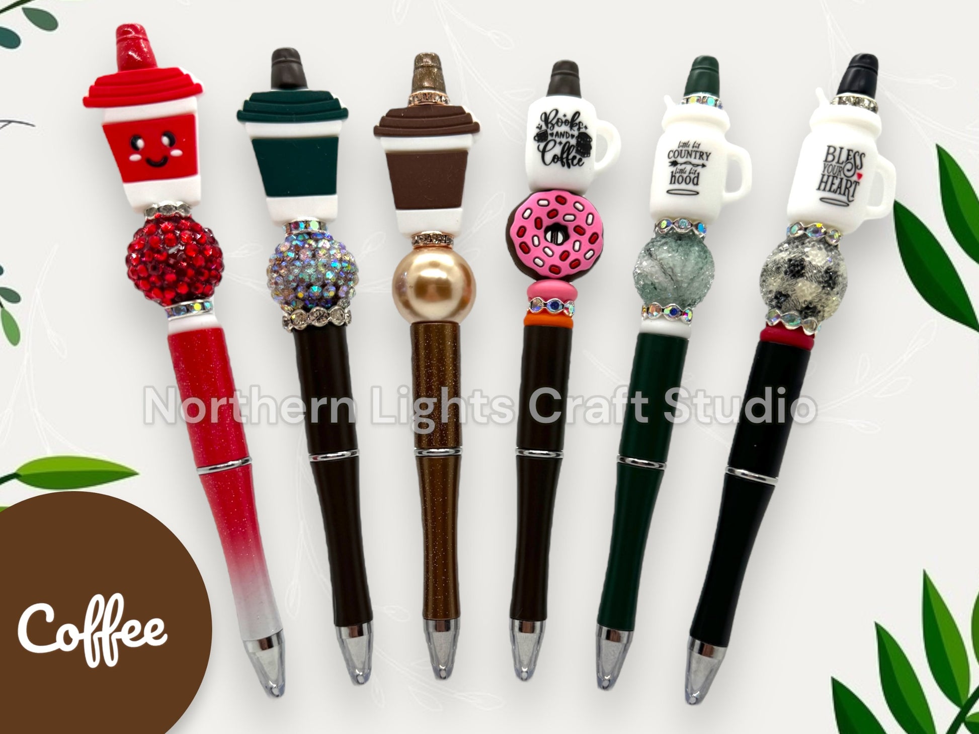 Our collection of coffee themed pens are just the thing to add a little zing to your desk! These pens are handmade with carefully selected beads and are refillable. The pens write with black ink and make the perfect gift for any occasion! Each pen will come with one ink refill.