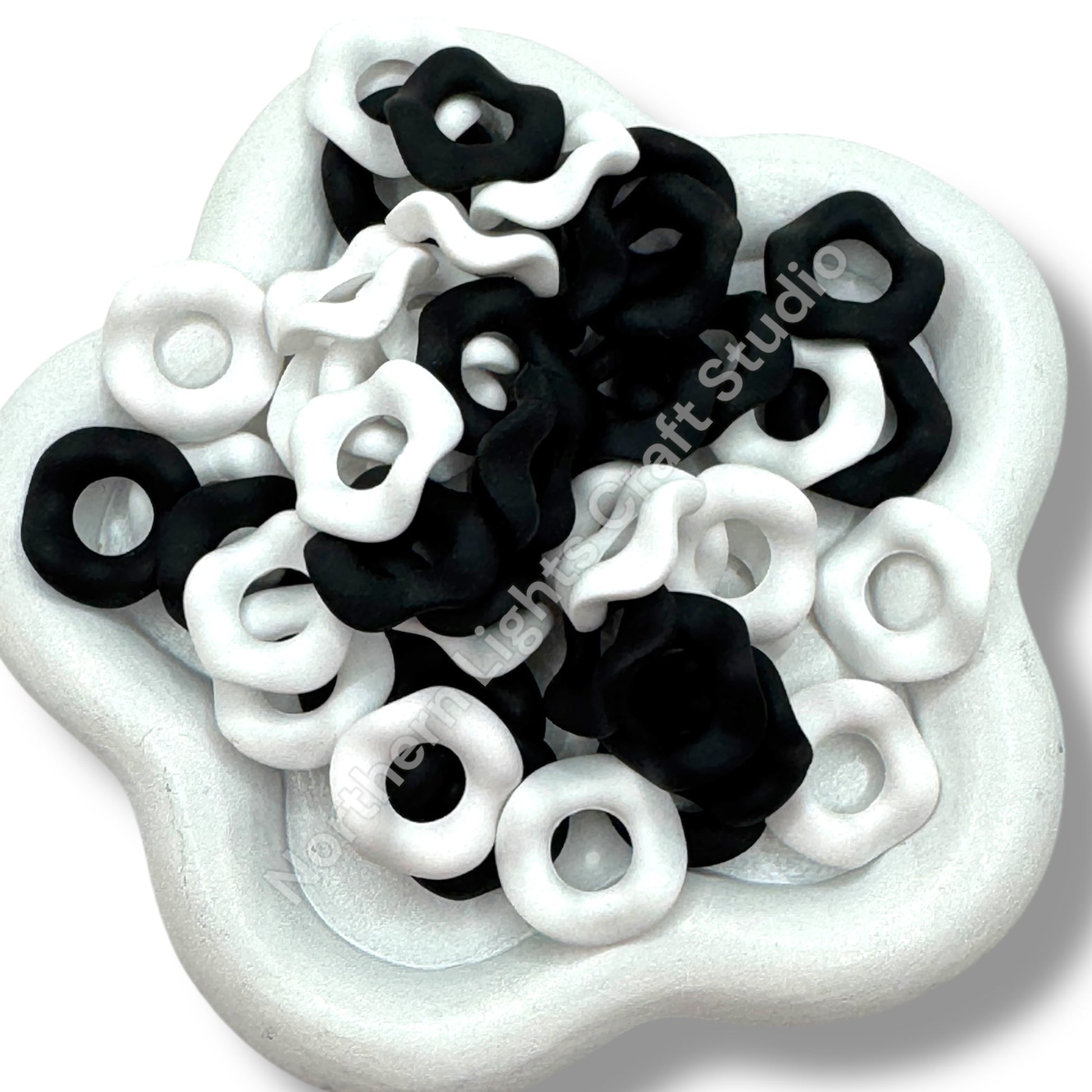 Price is for one 50 mix of black and white wavy 16mm spacers in the natte finish. Be sure to check out our other wavy spacer mixes and pair them with our colorful fuzzy spacers!