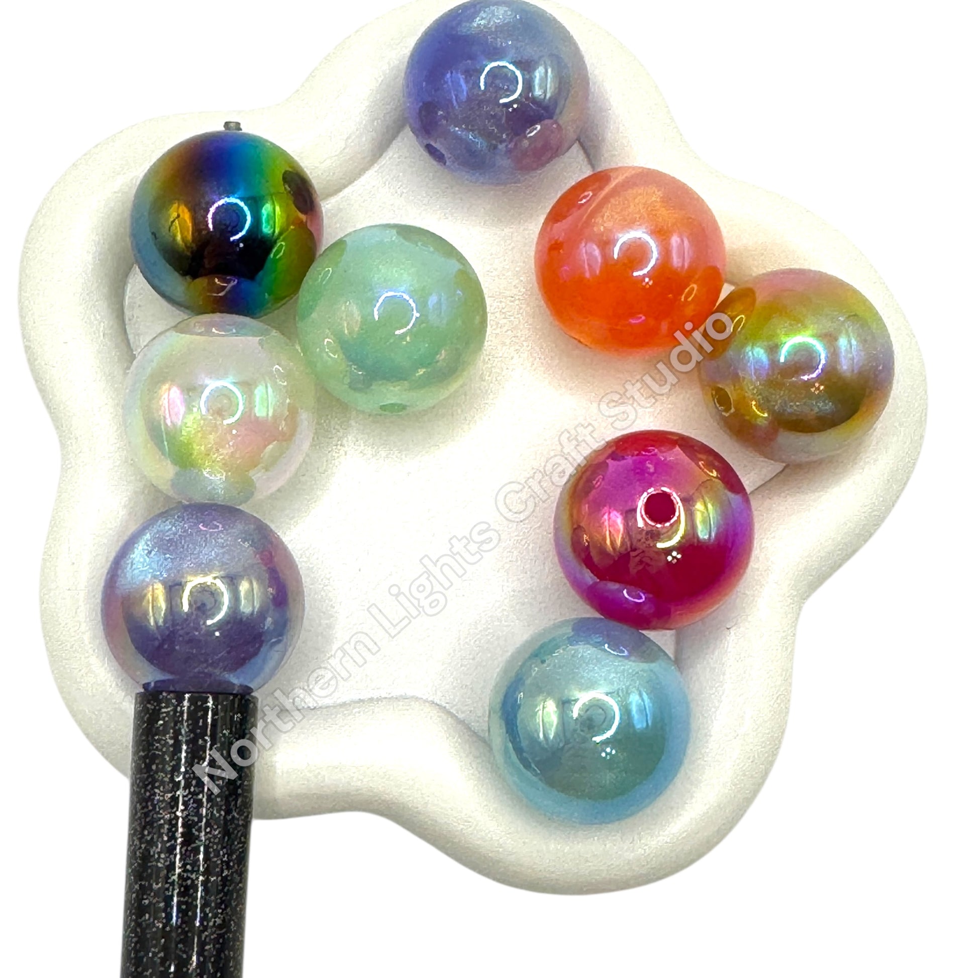 Price is for one 10pc. random color mix of 20mm UV glittery galaxy beads. Beads have a beautiful glittery galaxy effect inside with a UV irridescent coating on the outside.