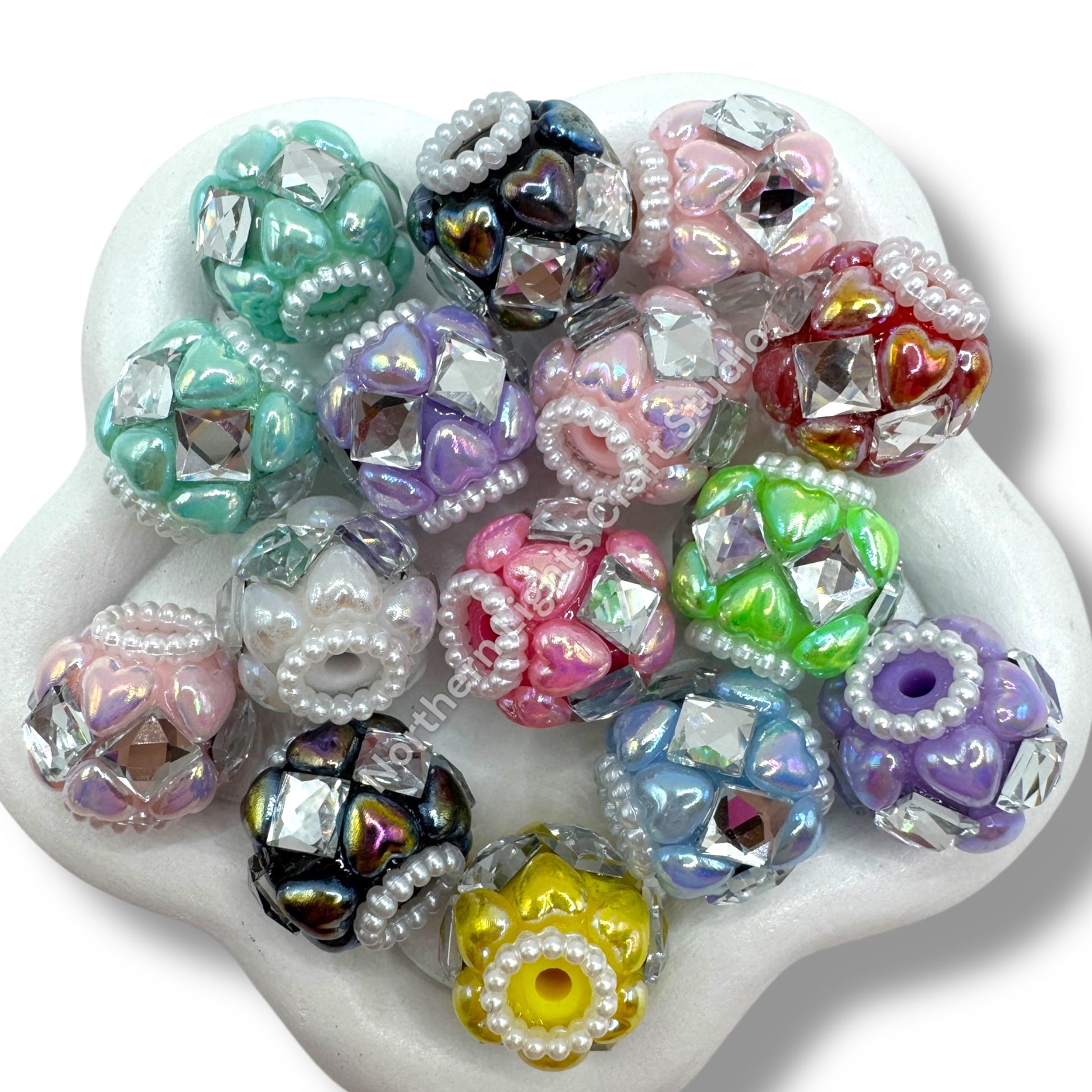 Price is for one mixed color bag of 5 pcs, colors chosen at random. Holes are large enough to fit pens. Beads are approximately 17-18mm. Beads have heart shaped pearly finish shiny hearts on the top and bottom wiht diamond crystal accents in the middle. Due to the nandmade nature of these beads, there may be irregularities.