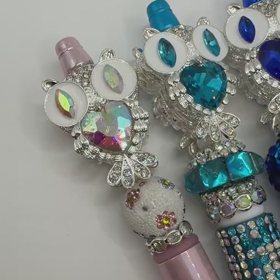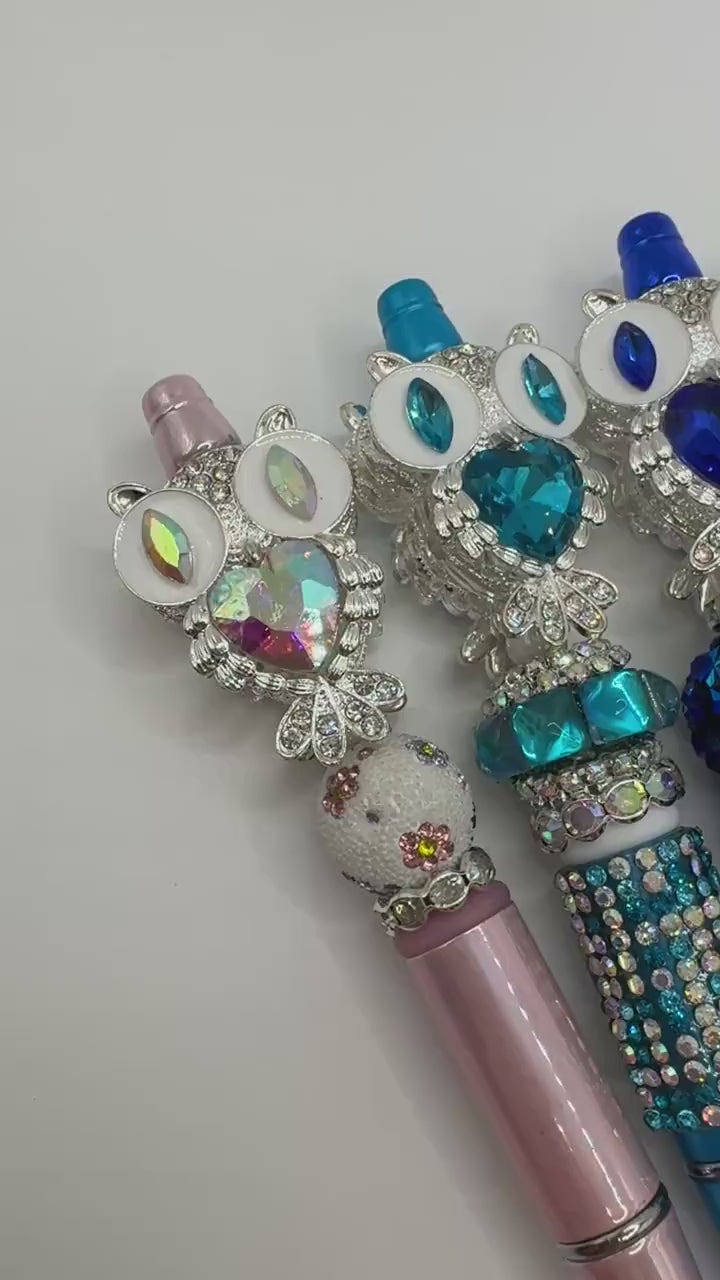 Price is for one pen. Our silver crystal owl pens in a range of colors are handcrafted writing tools that combines elegance and functionality. Each pen is approximately 6-6.5" long. The pens write 1.0 black ink and are medium ball point pens. They are refillable with refills that are specifically considered "beaded pen" ink refills. Each pen purchased comes with one free ink refill while supplies last.