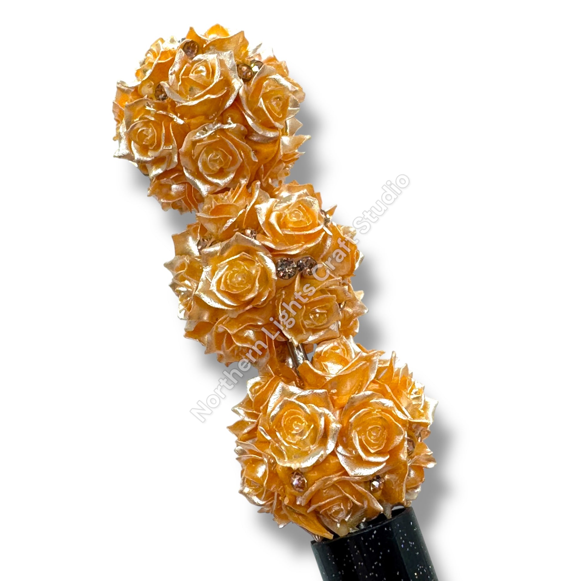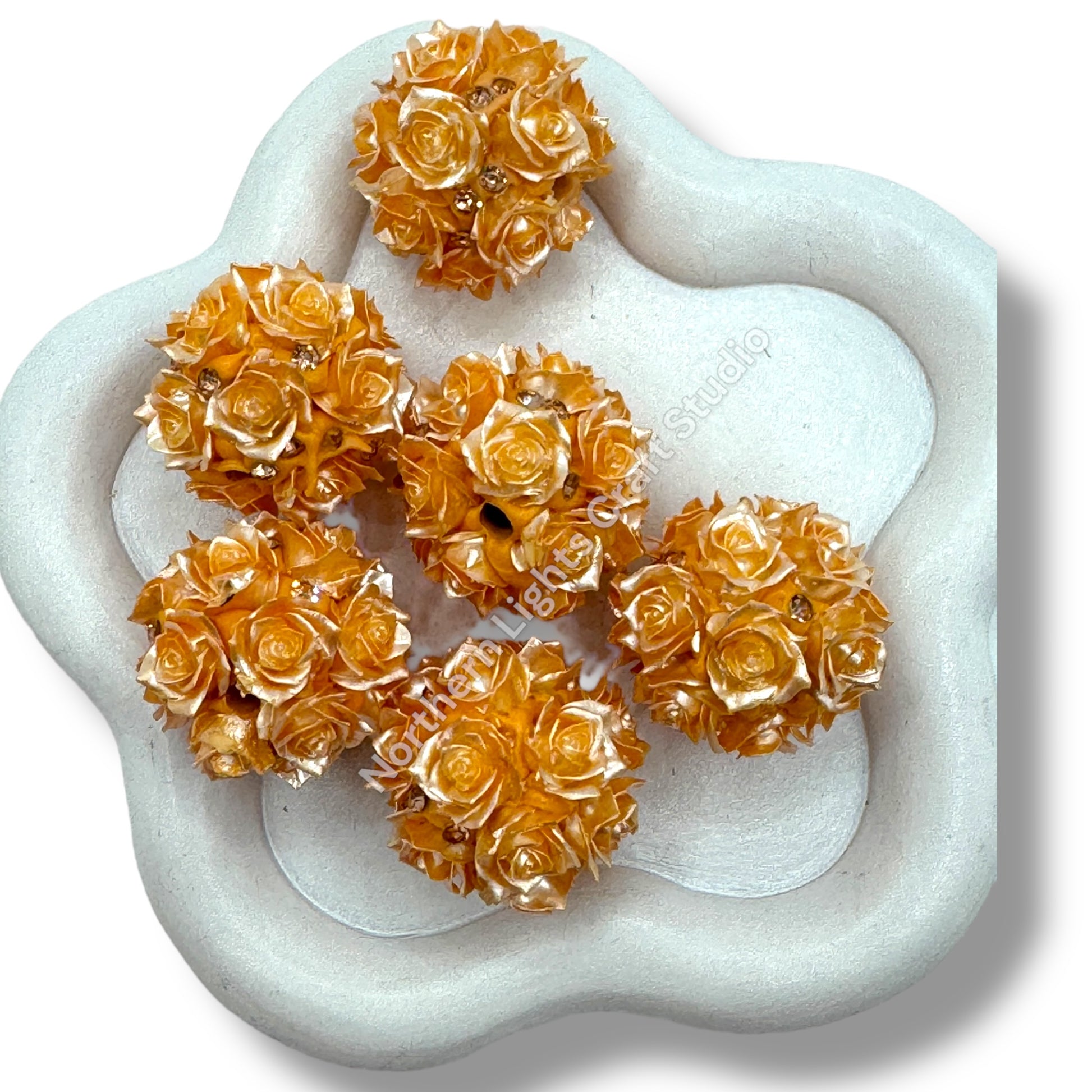 Price is for one pack of 5 golden orange flower beads. Beads are made of a clay base with acrylic roses and rhinestones placed around the bead. Flowers have a lusterous pearl finish and are approximately 20-22mm.