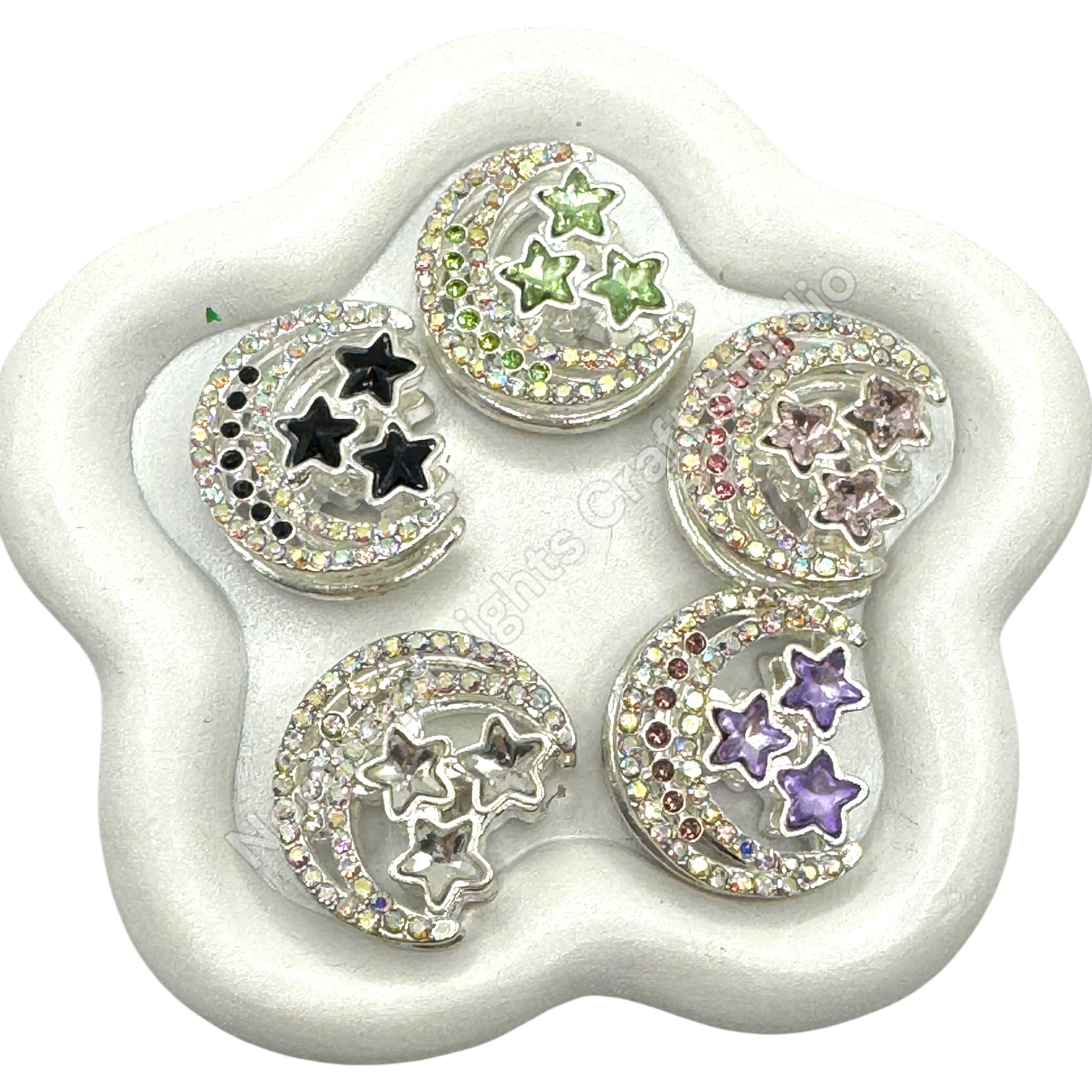 Price is for a randomly pulled mix of 4 flower beads. Each bead weighs approximately .3oz. and is approximately 20.3mm wide x 25.3mm tall Expertly crafted with metal silver alloy and glass. The moon is outlines with AB rhinestones and hug a trio of stars in the center. Holes are drilled all the way through and are large enough to fit beadable pens and jewelry crafts. Colors may vary slightly due to handmade nature.