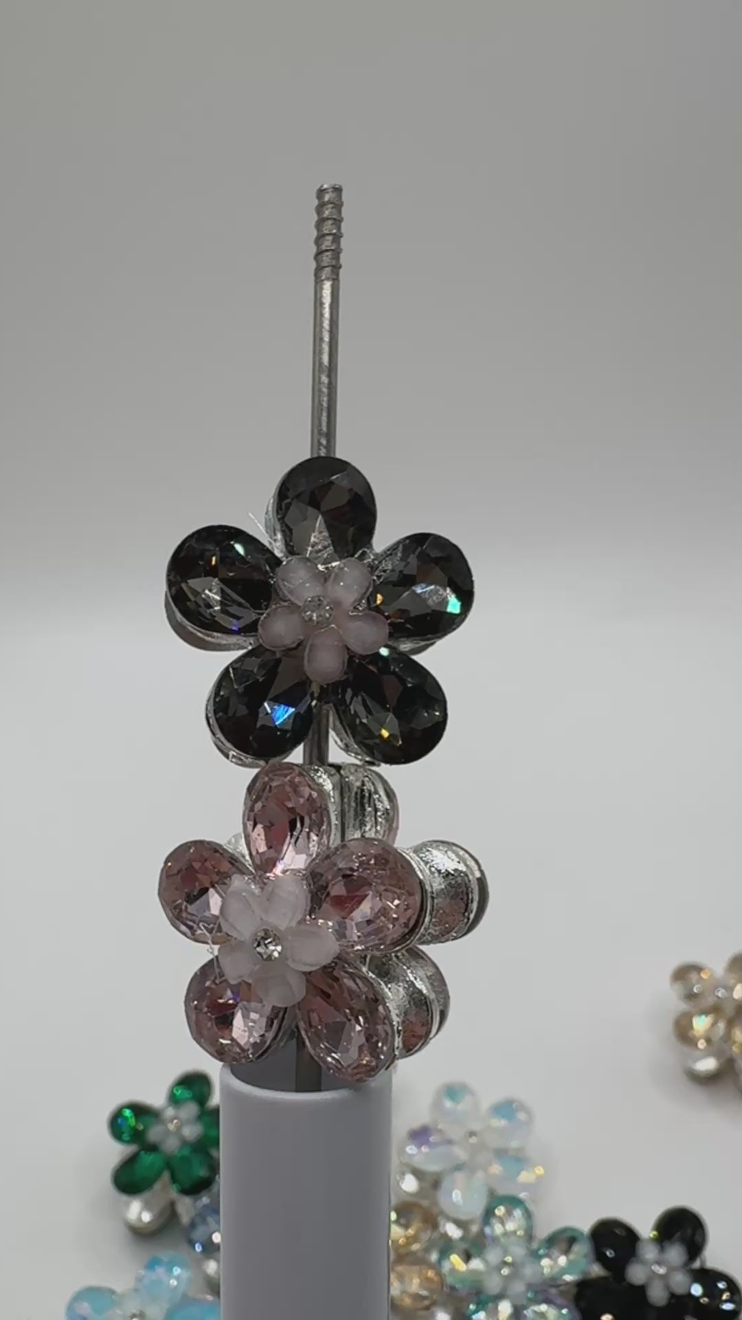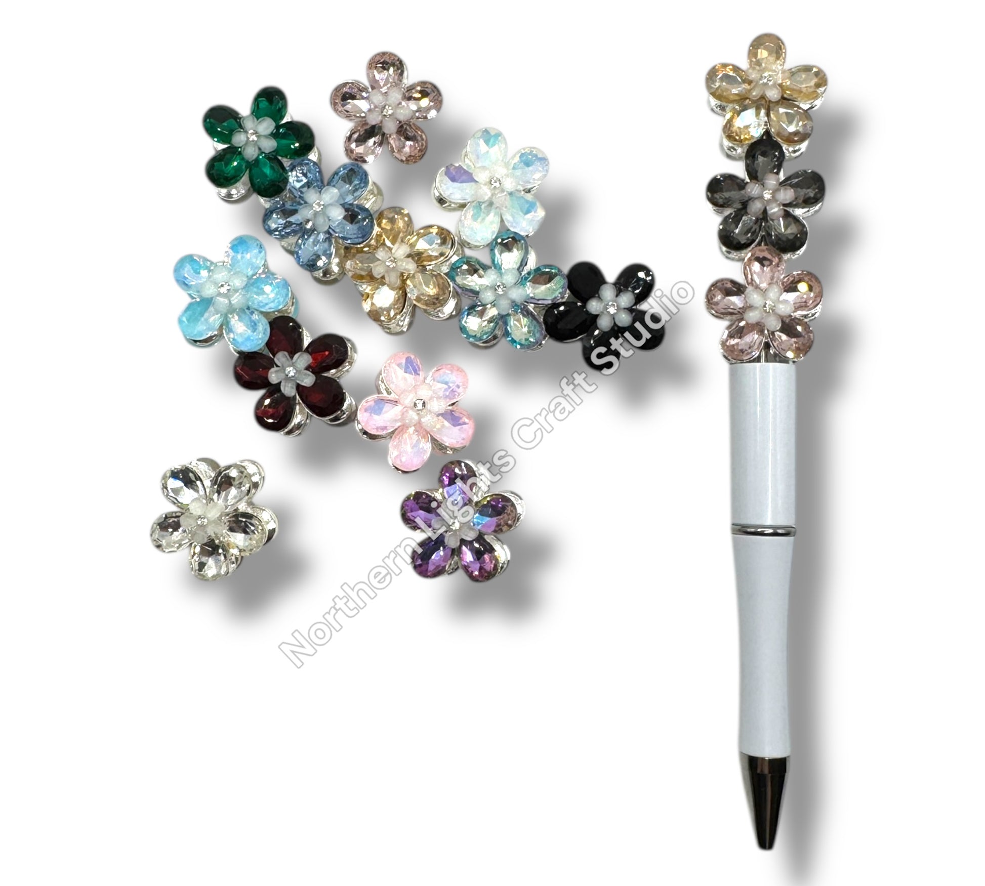 Price is for a randomly pulled mix of 4 flower beads. Expertly crafted with metal silver alloy and glass, our flower metal beads are approximately 21mmx16mm and add a unique touch to any beadable item. Their drilled design ensures easy placement on items like beadable pens and keychains. Colors may vary slightly due to handmade nature.