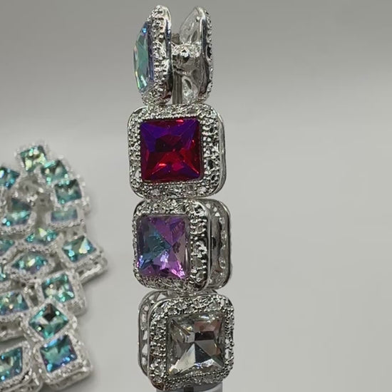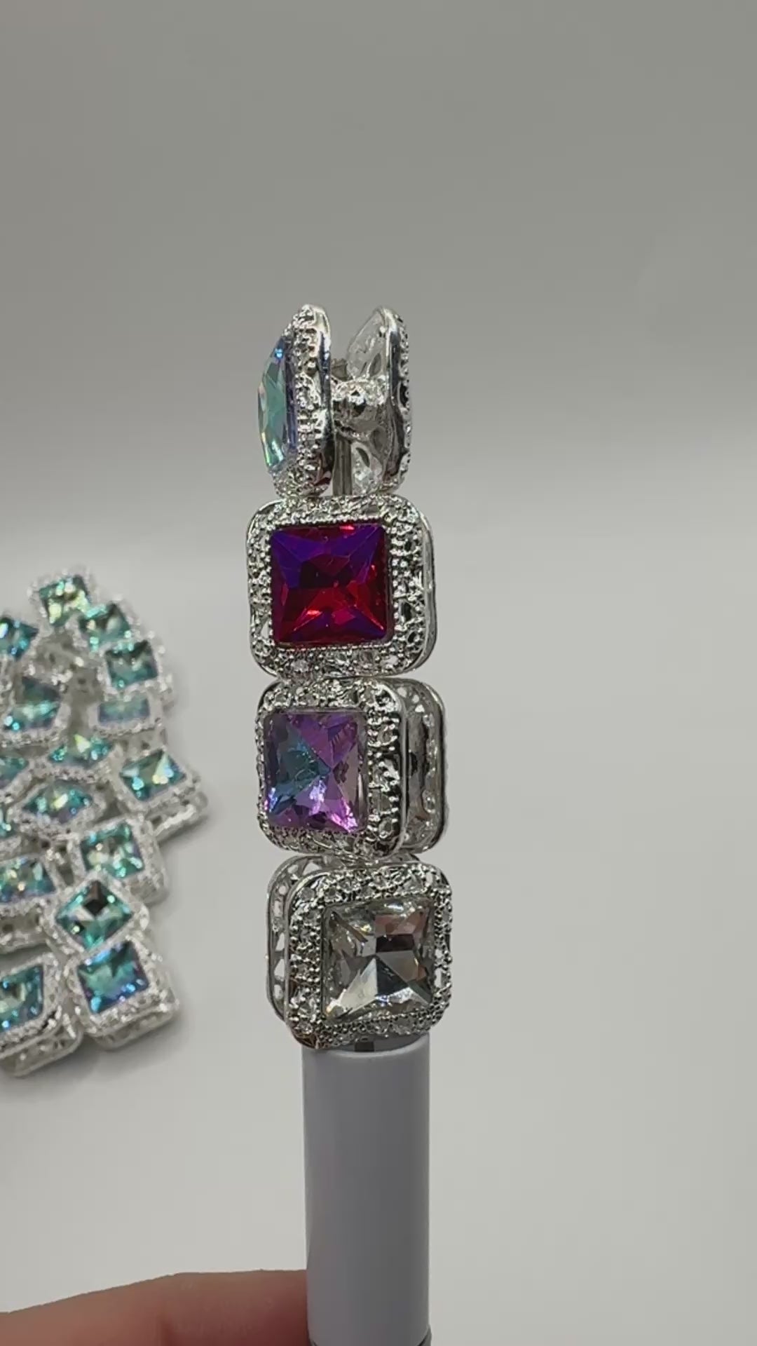 Expertly crafted with metal silver alloy and glass, our 16mm double side crystal square beads add a unique touch to any beadable item. Their drilled design ensures easy placement on items like beadable pens and keychains. The flash colors have a hint of purple and blue in them to give them an irridescent shine that looks different depending on the light. Colors may vary slightly due to handmade nature.