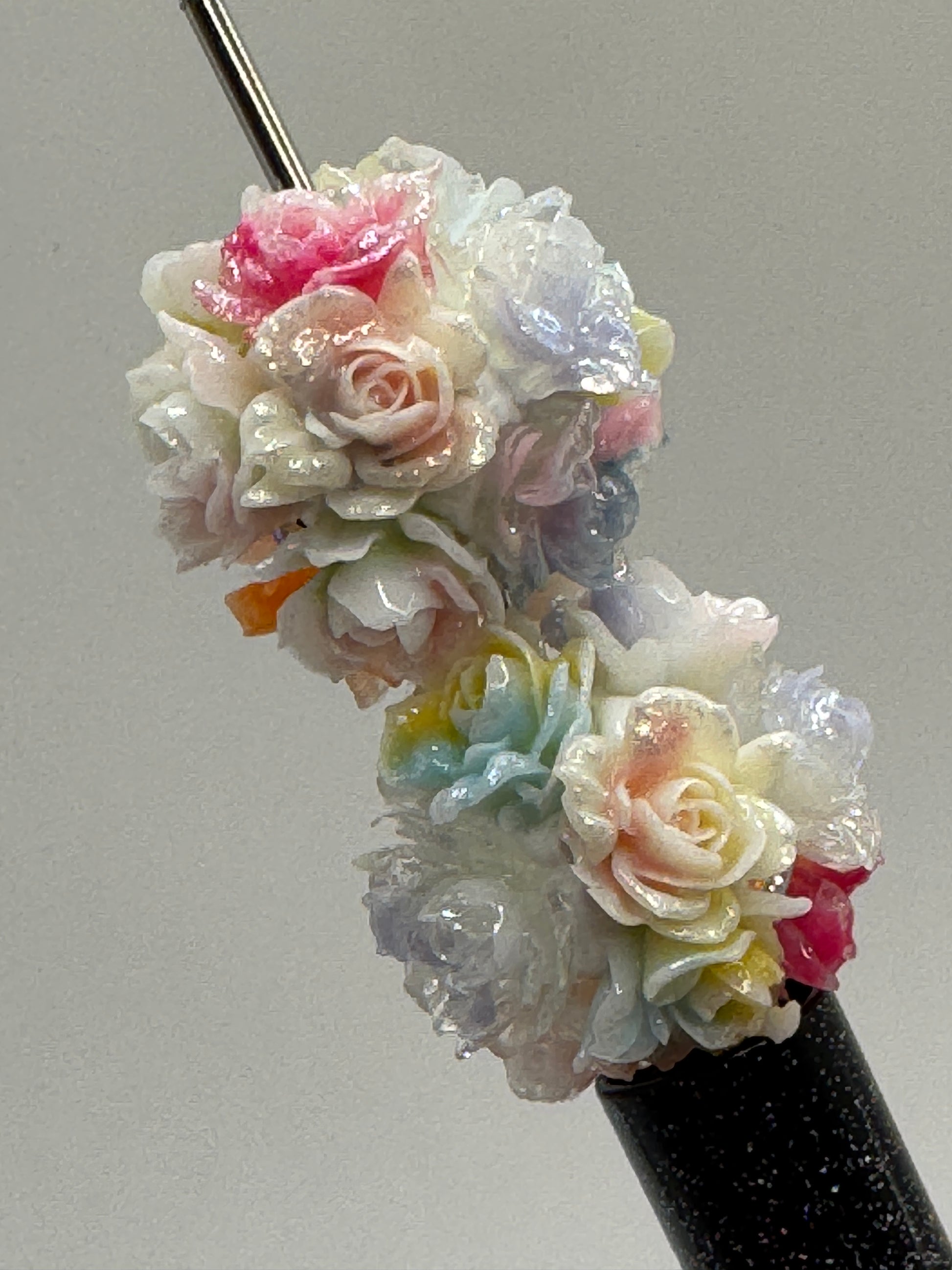 Price is for 2 pc. of one color bead - choose color option. These beads are approximately 22mm and are made of a clay base with shimmery flowers placed on top. Due to the handmade nature of these beads, there may be irregularities. in spacing and shape.