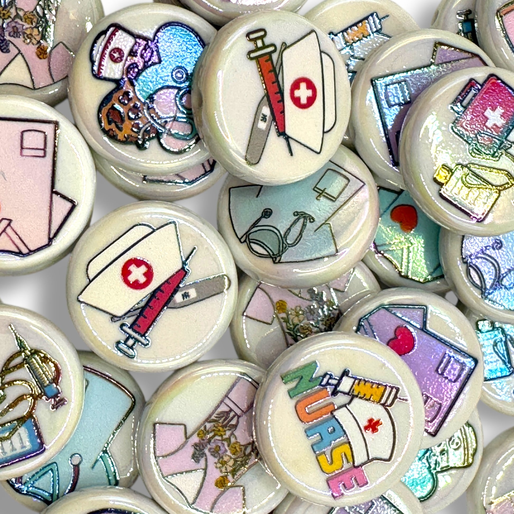 Price is for one randomly mixed bag of 10 nurse beads. The holes are big enough to fit on beadable pens or beadable bar keychains. Beads are round and printed on both side. They measure approximately 23.6mm.