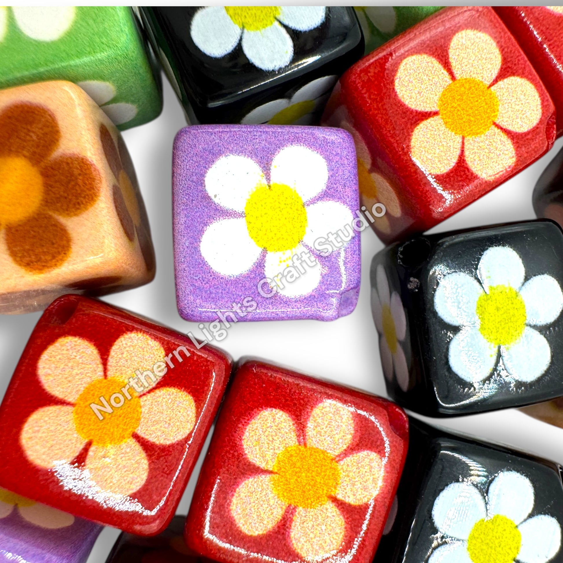 Price is for one 10 pc. random mix of retro Flower printed diagonal cube beads. Cubes measure approximately 12mm x 12mm. Holes on the cubes run from the bottom corner to the top corner making them a diagonal hole. Holes are large enough to fit beadable pens although you may have to slightly twist gently on some of them.