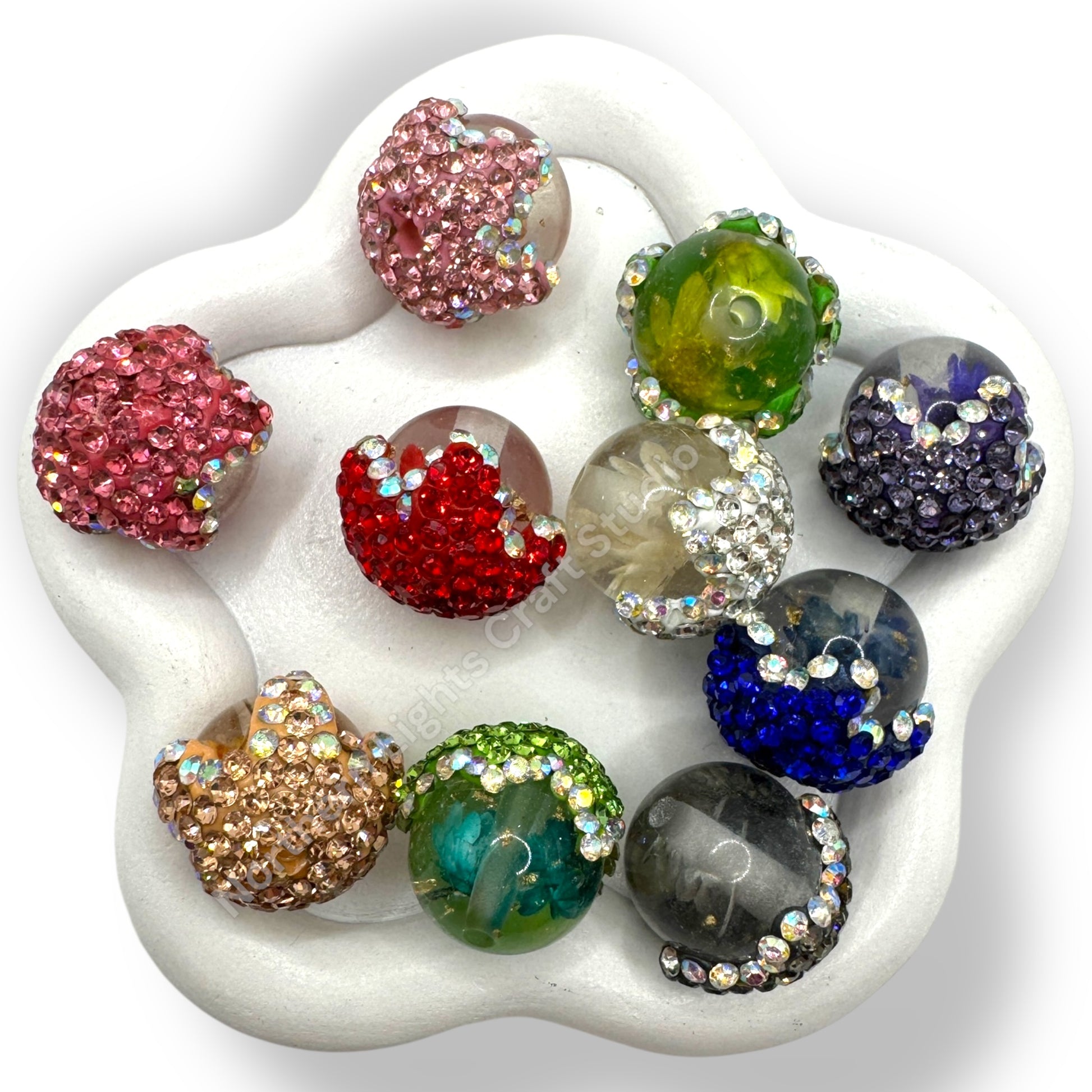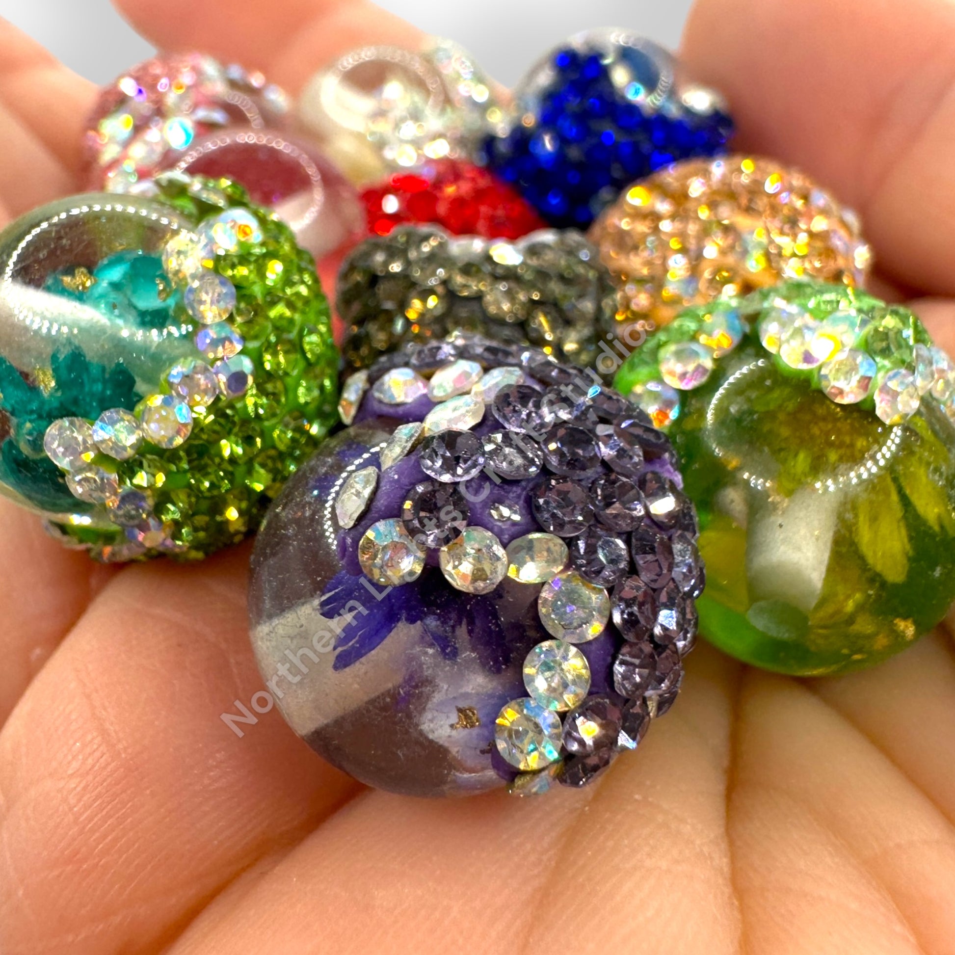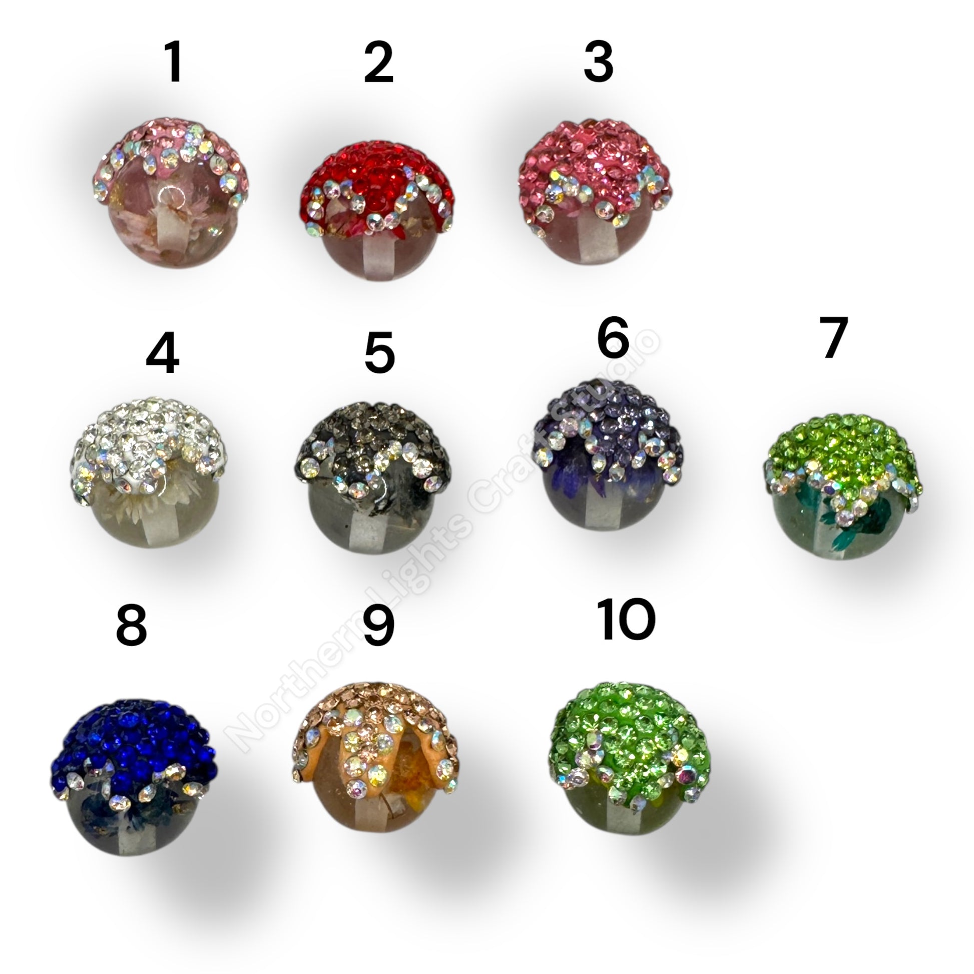 Price is for ONE bead. These acrylic beads have a dried flower inside the base topped with a drip style rhinestone bead cap. These beads will fit pens, but some may have to be twisted onto the pen or drilled to fit cleanly on the pen. Due to the handmade nature of the clay beads, there may be irregularities.