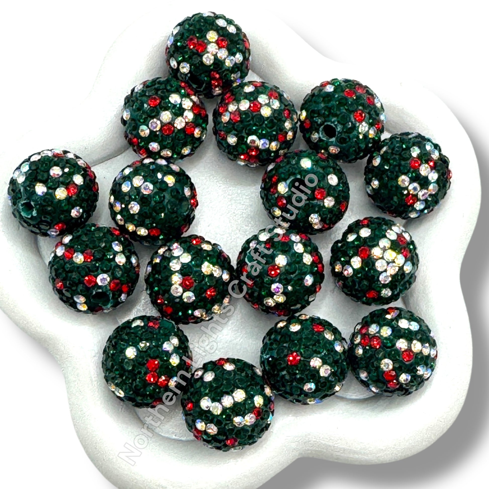 Price is for 10 16mm Christmas Rhinestone beads. These clay based beads have red, green, and ab rhinestones placed in the 16mm base. The hole is large enough to fit on beaded pens. Due to the handmade nature of the clay beads, there may be irregularities.