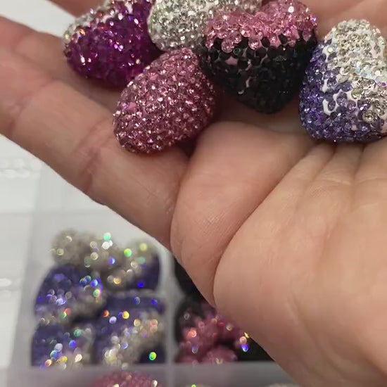 These 24x19x13mm premium rhinestone heart beads have full coverage of crystals for a pave finish. THE HOLES ARE NOT BIG ENOUGH TO FIT ON BEADABLE PENS OR KEYCHAINS UNLESS YOU DRILL A HOLE INTO THEM! They are perfect for jewelry making!