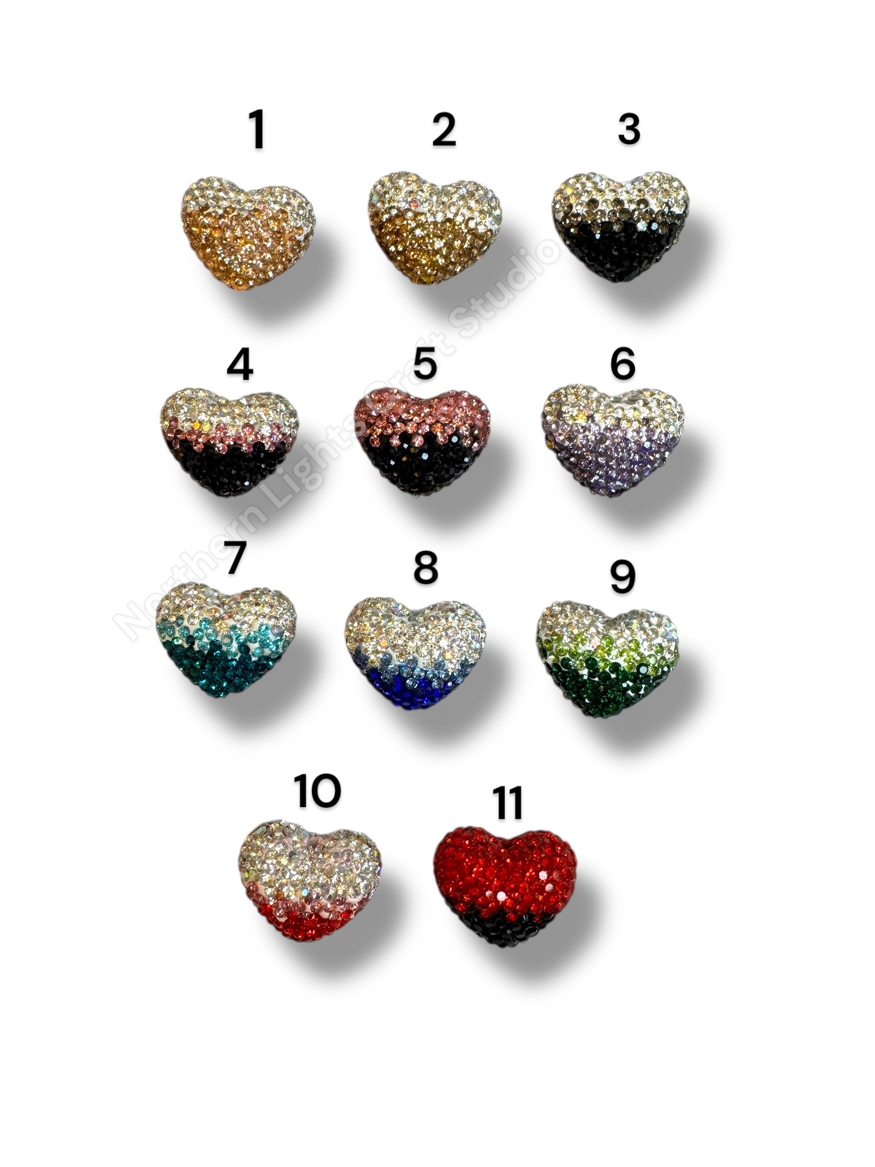 These 24x19x13mm premium rhinestone heart beads have full coverage of crystals for a pave finish. THE HOLES ARE NOT BIG ENOUGH TO FIT ON BEADABLE PENS OR KEYCHAINS UNLESS YOU DRILL A HOLE INTO THEM! They are perfect for jewelry making!