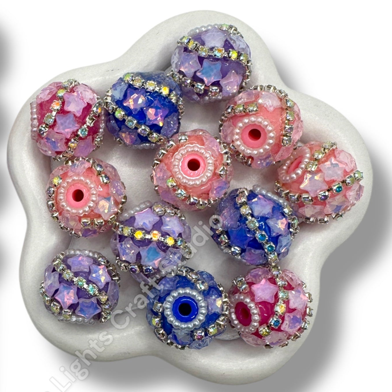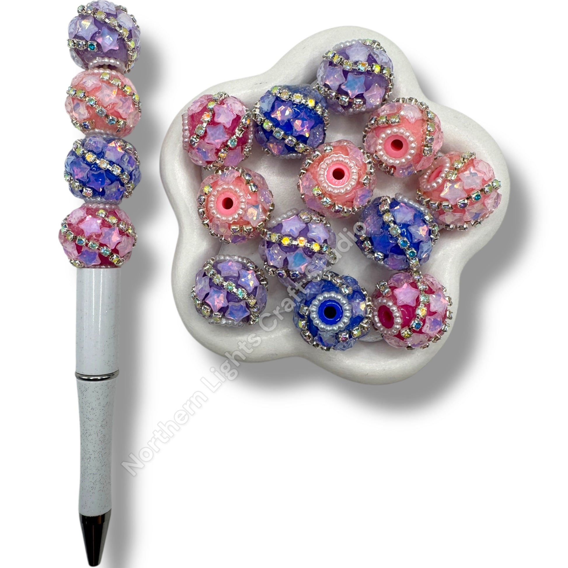 Price is for one pack of 4 beads. Each pack will have one each of purple, light pink, blue, and dark pink. These acrylic beads have glass star charms with rhinestone chain embelishments. Due to the handmade nature of these specialty beads, there may be irregularities. We do our best to accurately depict colors, but there may be differences due to lighting, photography, or screen settings.