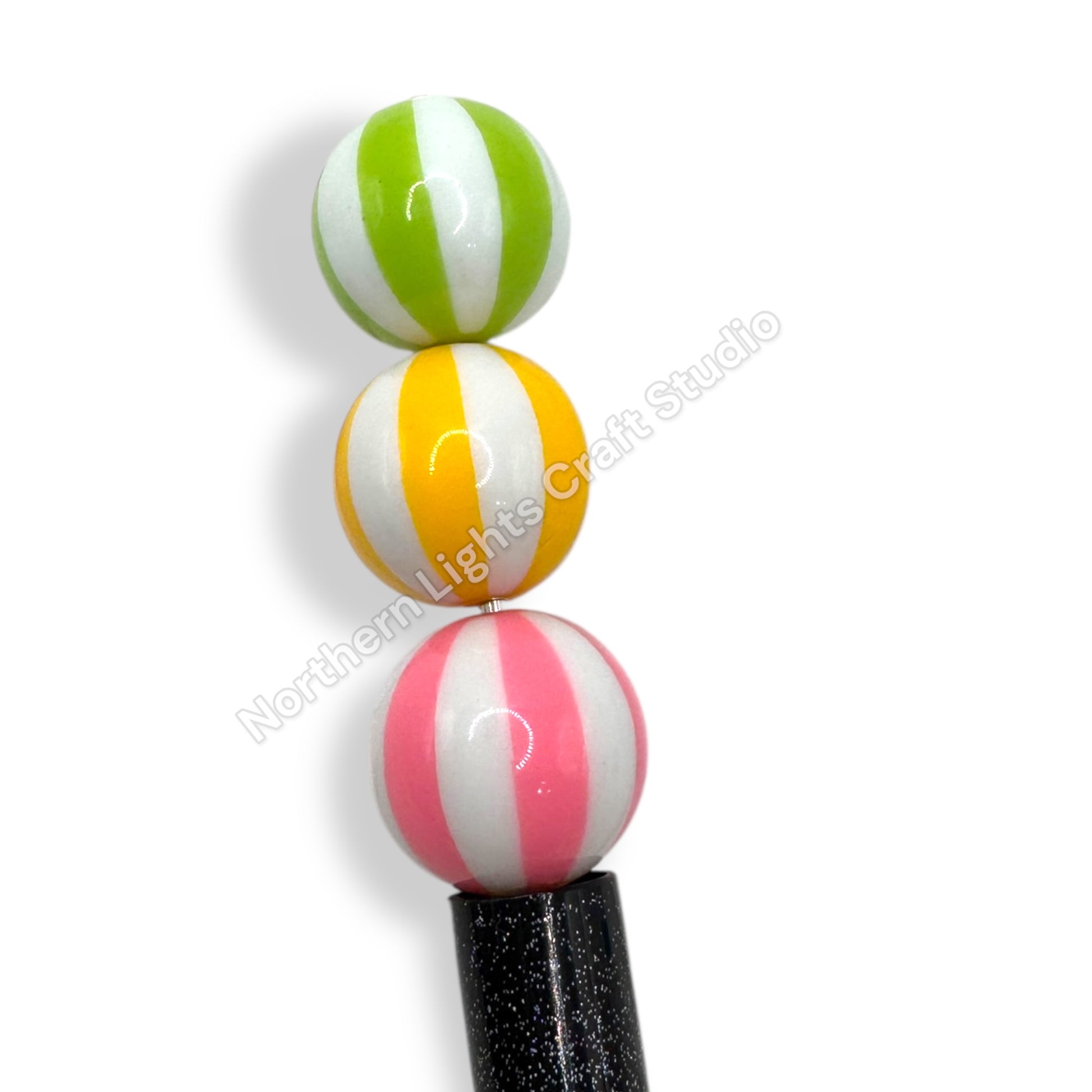 Price is for one radomly mixed 10pc. color bag of 20mm beads. Beads feature colorful stripes. Holes are big enough to fit beaded pens.