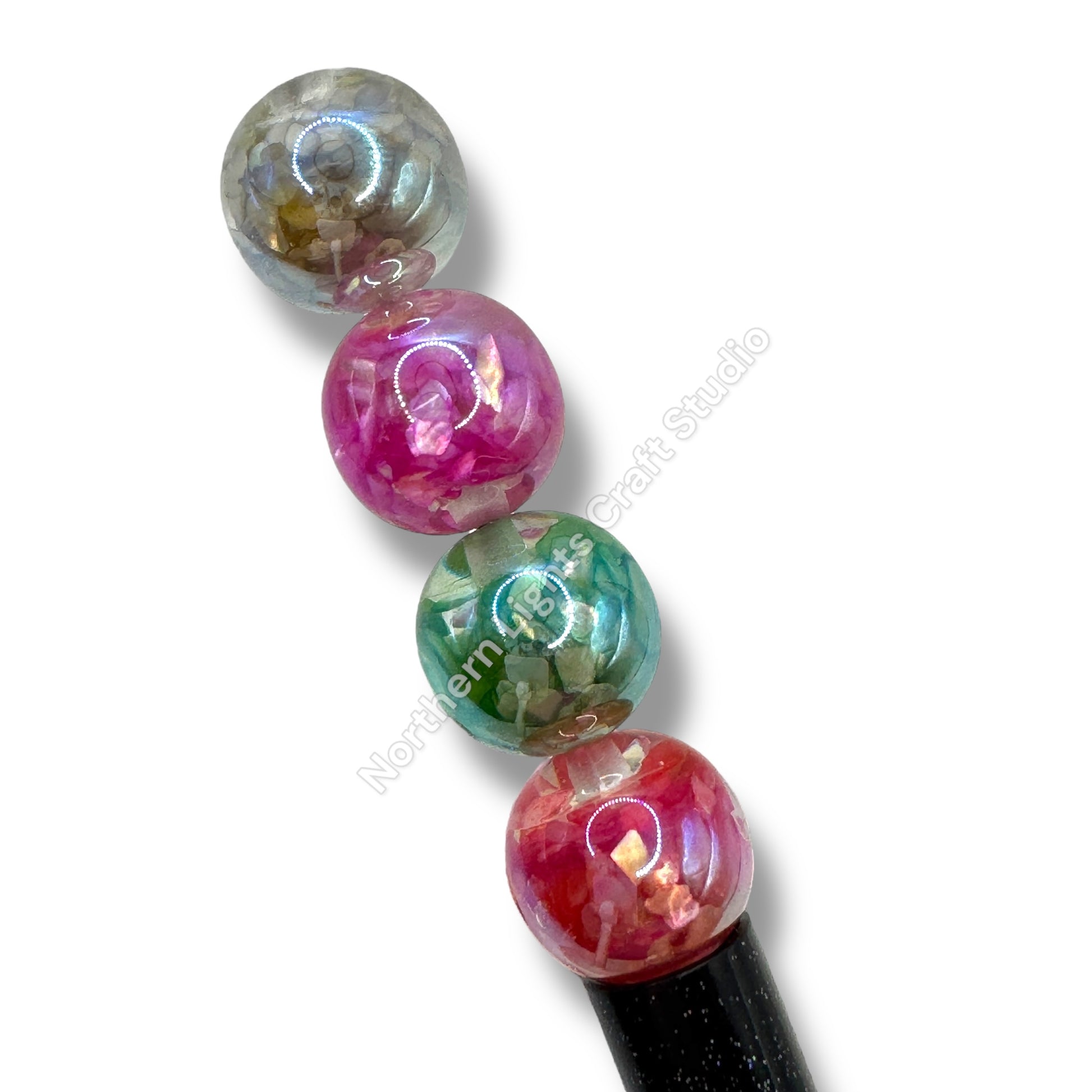 Price is for one random color pack of 20 16mm beads. Beads are 16mm and are made of acrylic. These beautiful high quality beads have real pieces of shell inside and are coated with UV. Holes are big enough to fit beaded pens.