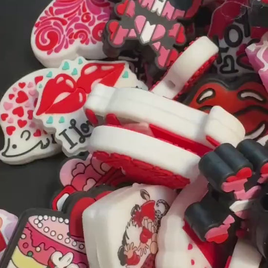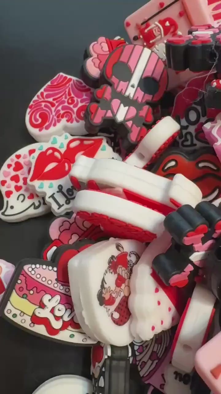 Choose from our Valentine themed mixes of either 10 or 20 pieces. The focal mixes will consist of focals in the picture and in the video only. There are no duplicates in each mix bag. These adorable silicone focal beads are perfect for making beaded pens and beaded keychains! Price is for one bead. Due to screen differences, colors may be slightly different than actual bead. We do our best to accurately depict colors.